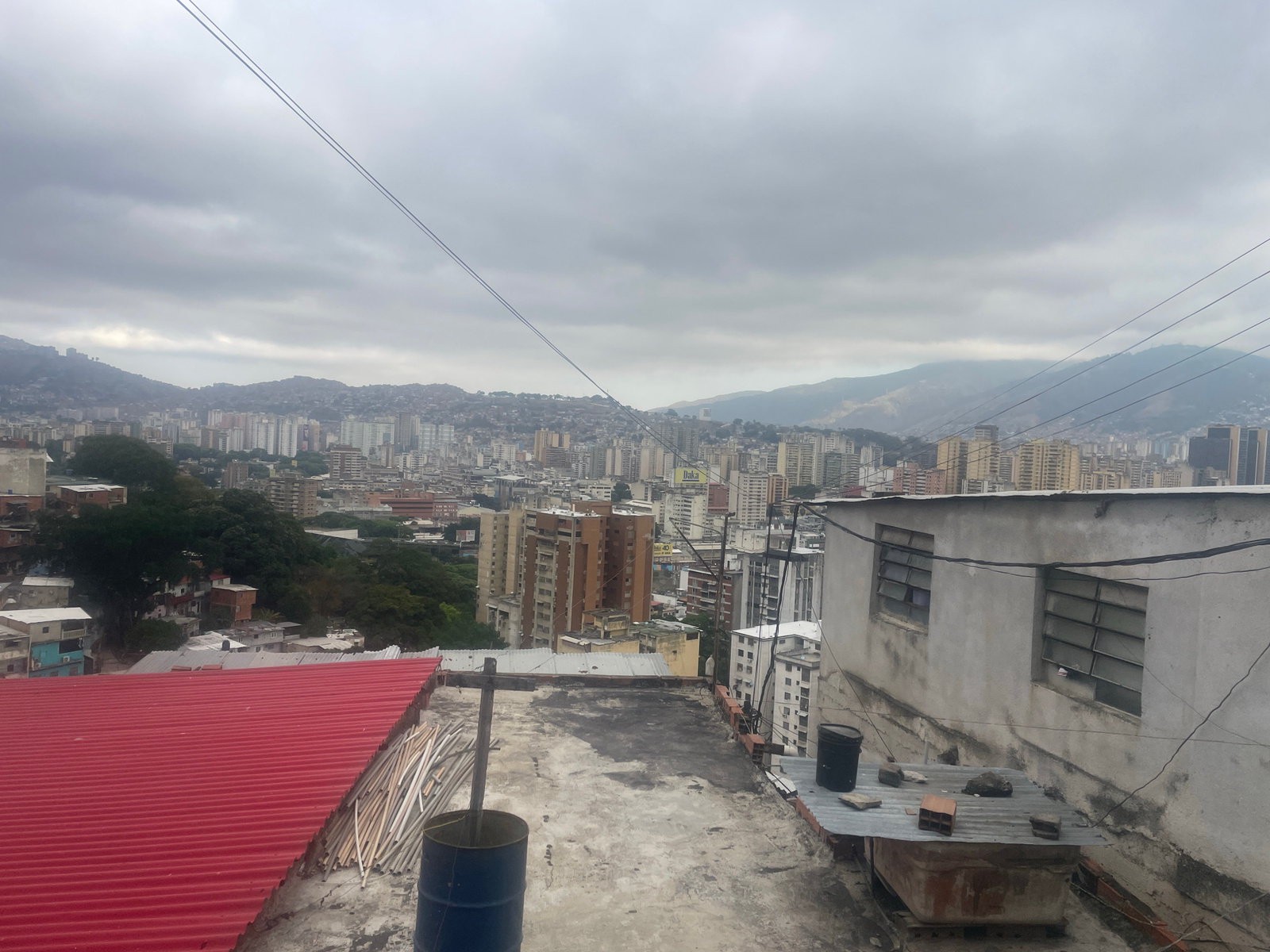 This image presents an elevated, panoramic view of a dense urban environment identified as Caracas, Venezuela, under an overcast sky. In the immediate foreground, a weathered concrete rooftop occupie…read more