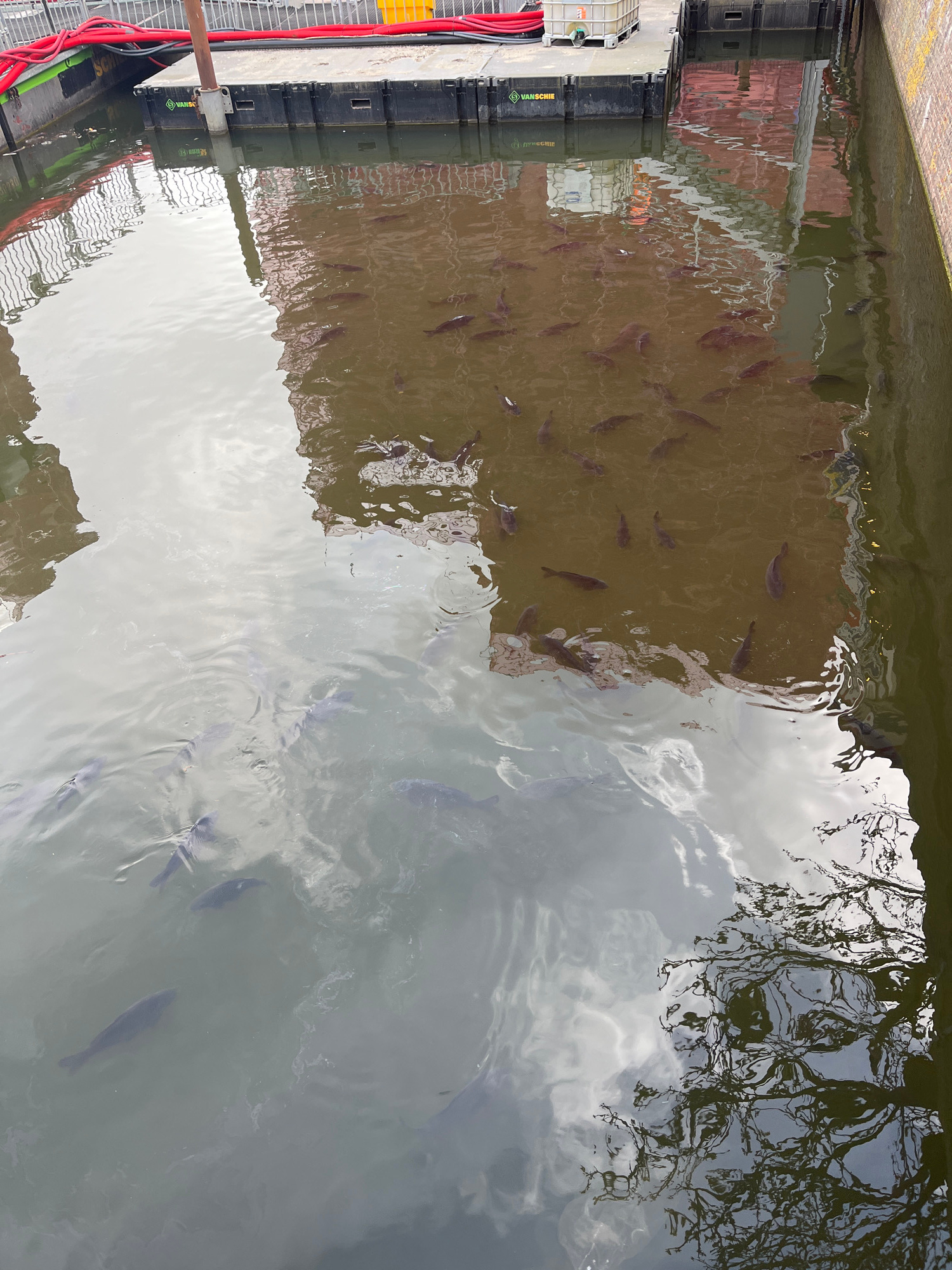 The image depicts an urban canal in The Hague, Netherlands, densely populated with fish. The water reflects the sky and the canal-side architecture, creating a distorted, mirror-like effect. The canal…read more