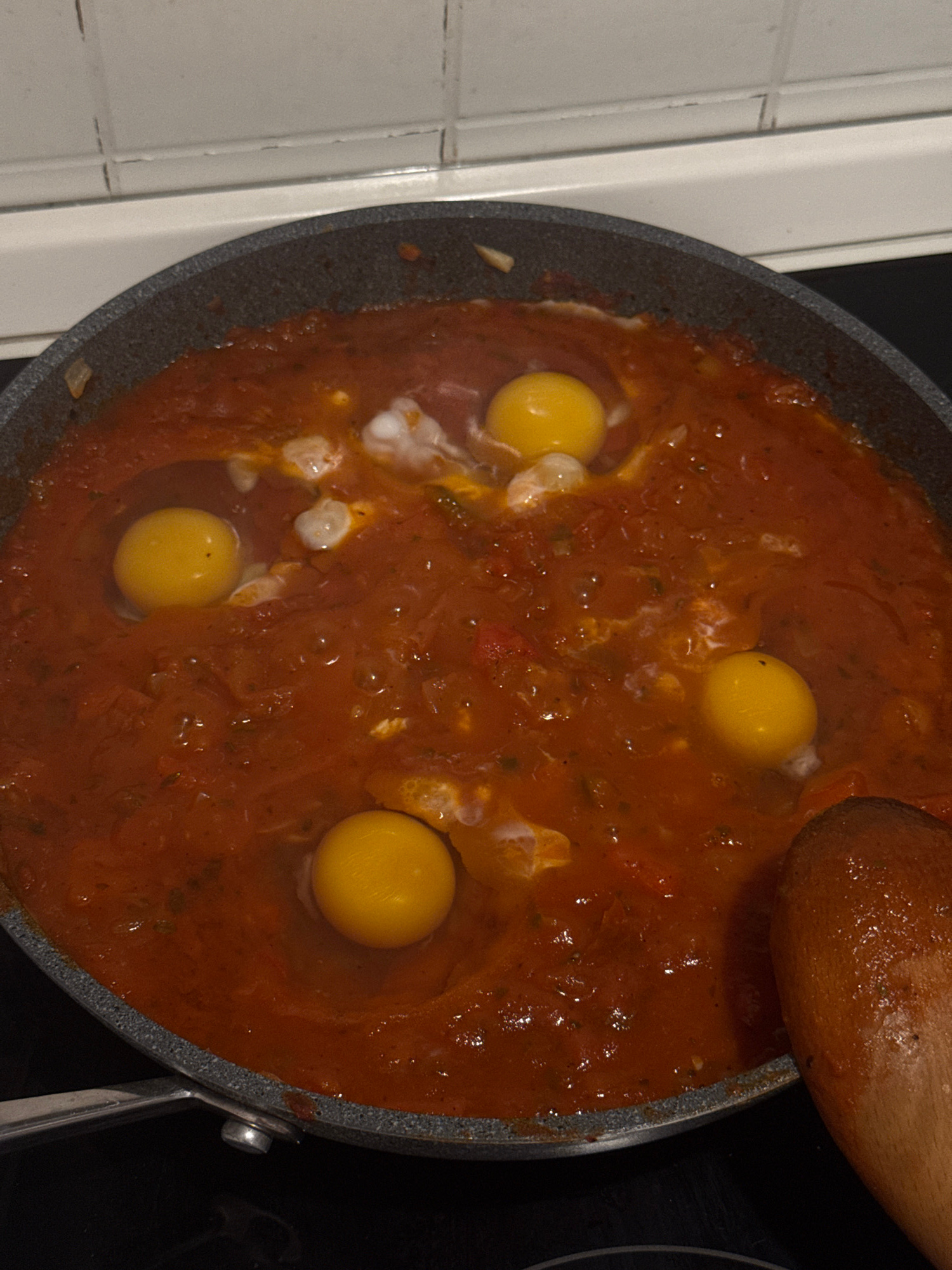 A close-up, high-angle shot captures a dark gray frying pan filled with a vibrant, reddish-orange tomato-based sauce, actively cooking. Scattered within the thick sauce are four distinct, bright yello…read more