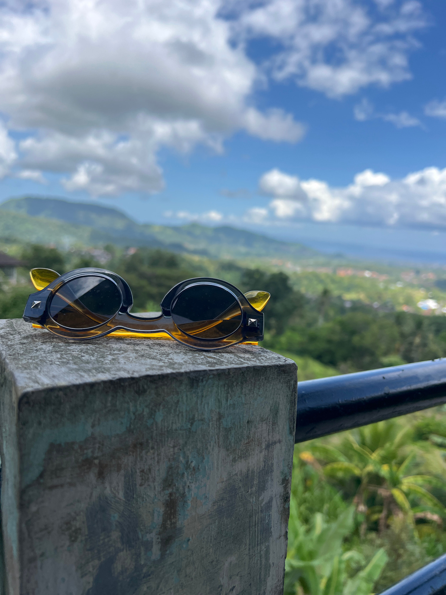 The image presents a pair of sunglasses resting on a weathered, grey, concrete ledge, with a black cylindrical post positioned behind it. The glasses have round, dark lenses and a yellow and tortoises…read more