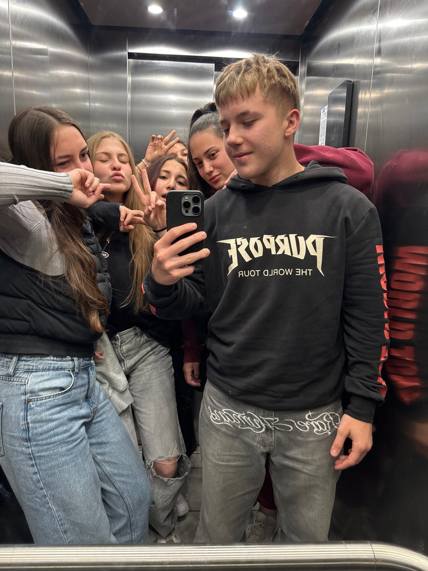 The image captures a group of five young individuals taking a mirror selfie inside an elevator in Sliven, Bulgaria. The setting is an enclosed space with polished, reflective metallic walls that show…read more