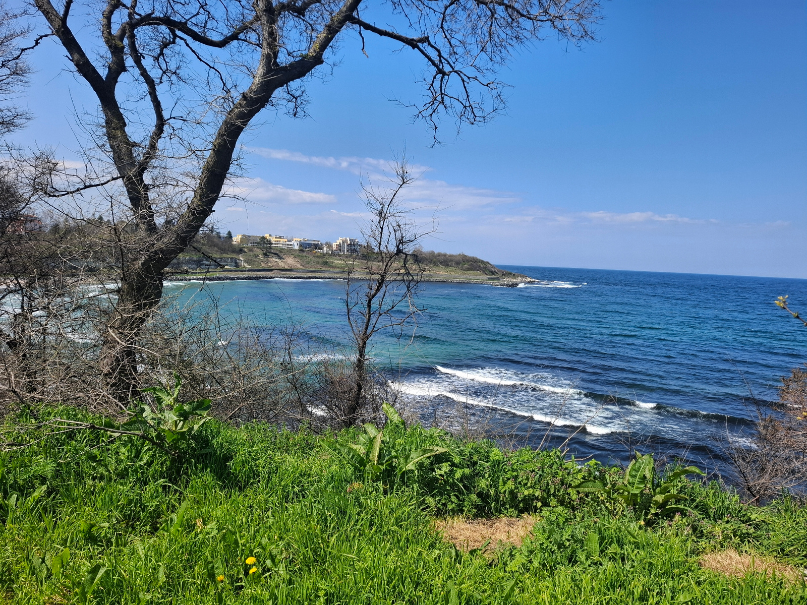 The image depicts a coastal view in Tsarevo, Bulgaria, featuring a blue sea with visible waves breaking along the shoreline. In the foreground, there is a green grassy area with patches of vegetation…read more