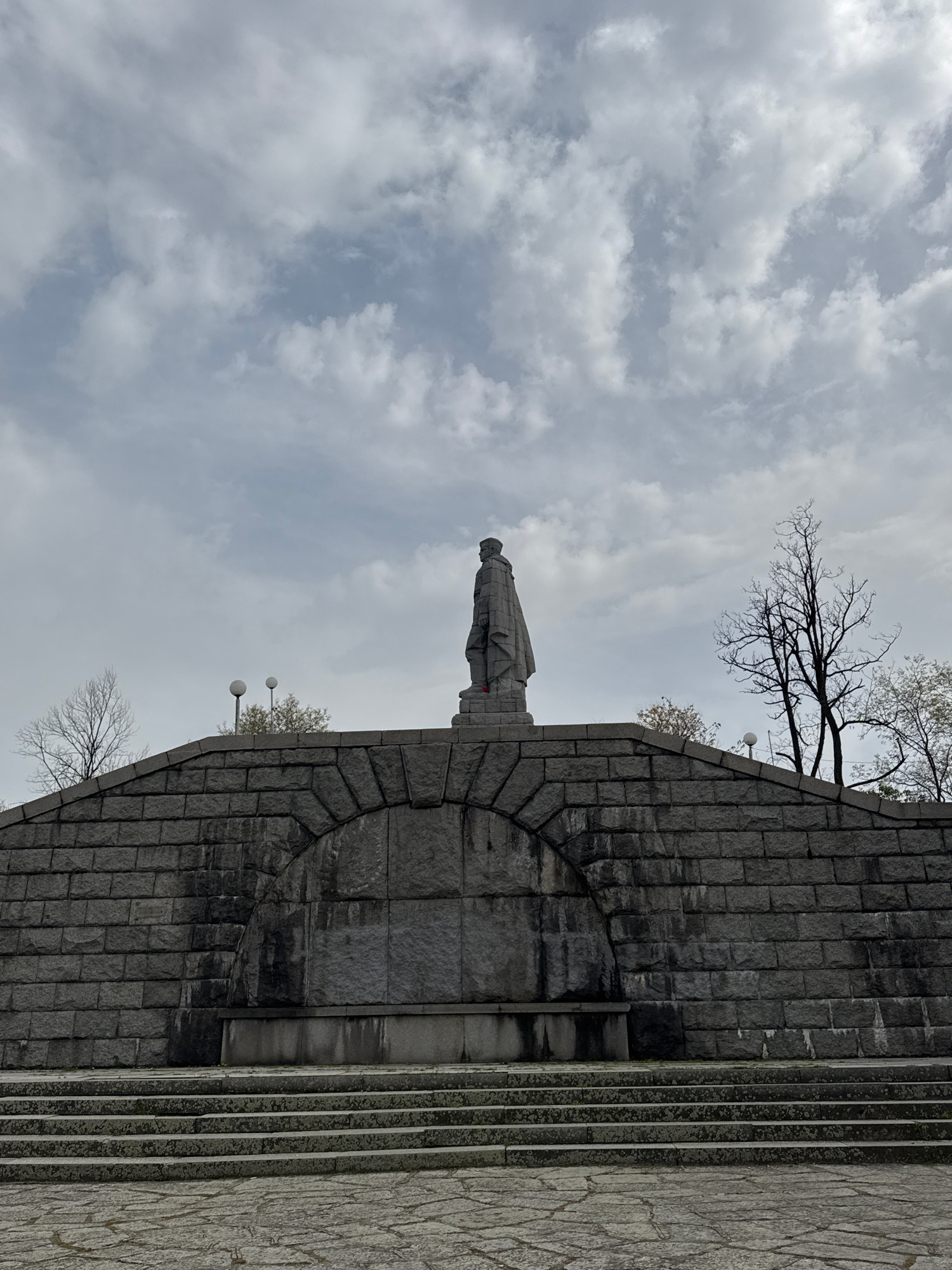 The image shows the Alyosha Monument in Plovdiv, Bulgaria, from a low angle, looking upwards. The monument is a concrete statue of a Soviet soldier, erected atop Bunardzhik Hill. In the background isβ¦read more