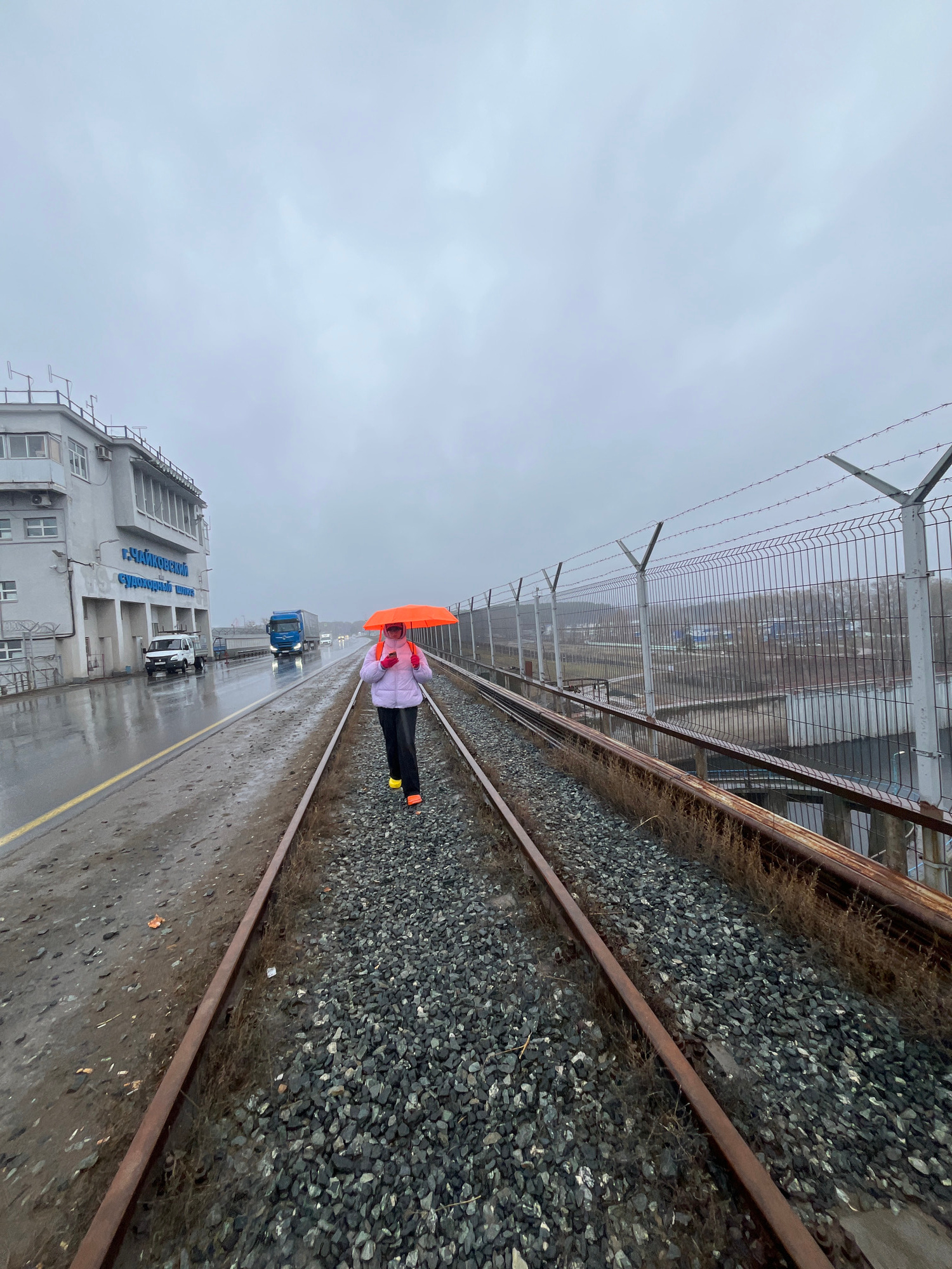 This image, presented in a sideways orientation, depicts an outdoor industrial scene in Chaikovsky, Russia, under an overcast, grey sky, suggesting a cool, damp day. The ground, including a paved road…read more