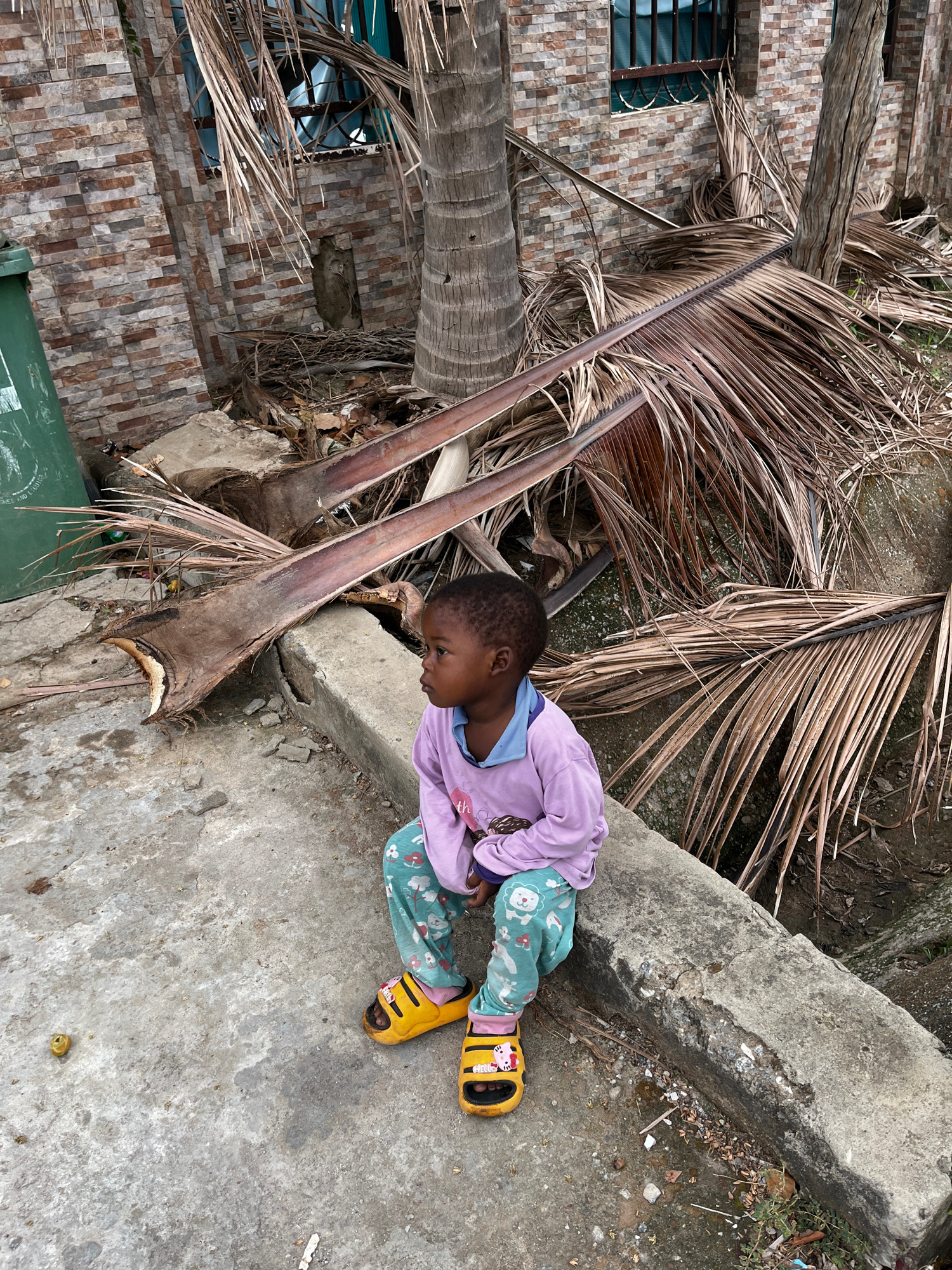 A young child in a purple shirt and light green pants is sitting on a concrete ledge outdoors. The child is wearing yellow sandals with cartoon characters. To the left is a fallen palm tree with dried…read more