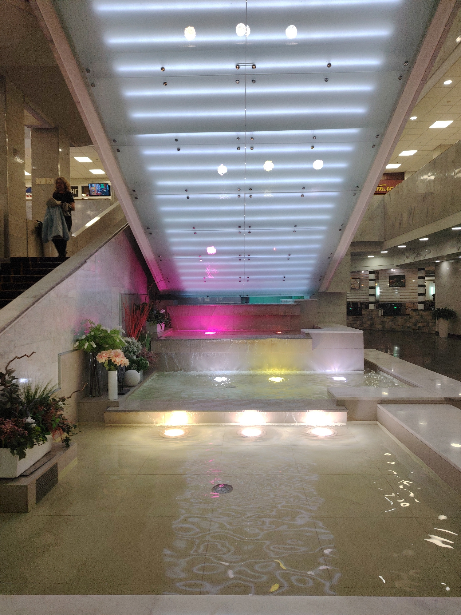 This vertical shot depicts a modern, multi-level indoor interior, likely a public lobby or commercial space, in Moscow, Russia. The central feature is an elaborate, multi-tiered waterfall and fountain…read more