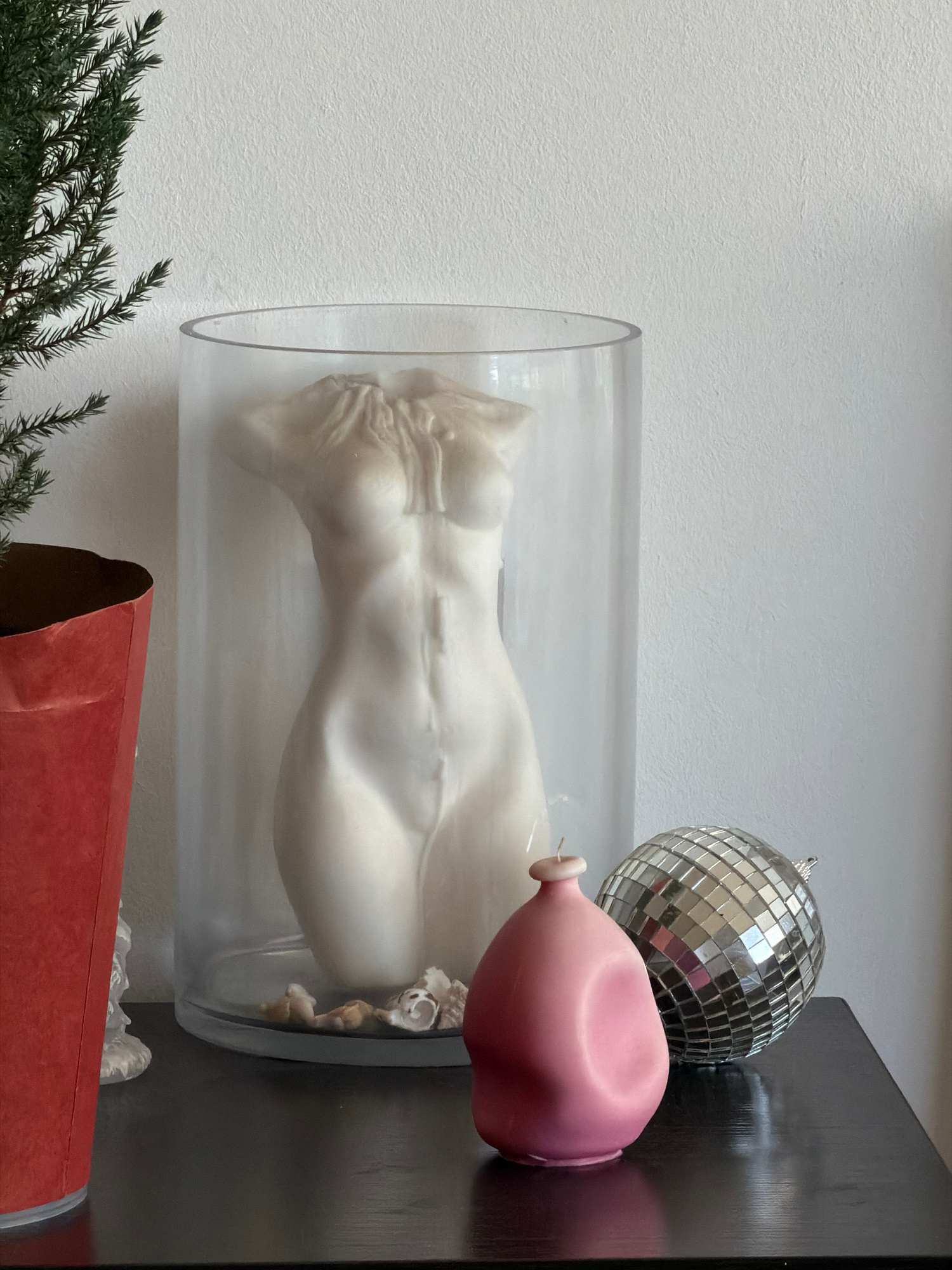 The image shows a white torso sculpture encased in a clear cylindrical tube, lying horizontally on a dark surface. Beside the tube are a disco ball and a deflated pink balloon. Below, partially visibl…read more