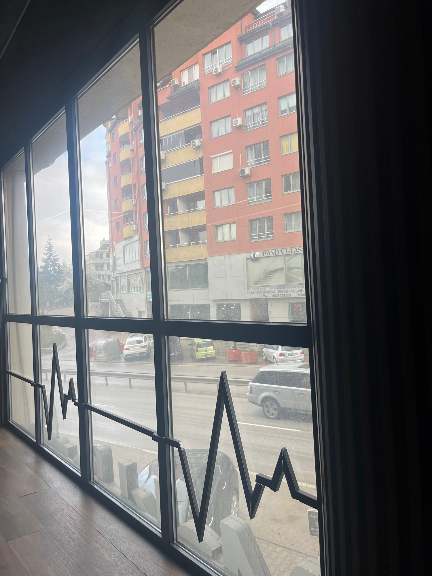 The image shows an interior view through a multi-pane window, revealing an urban scene in Sofia, Bulgaria. The foreground is defined by the window frame, which holds multiple panes of glass. Attached…read more