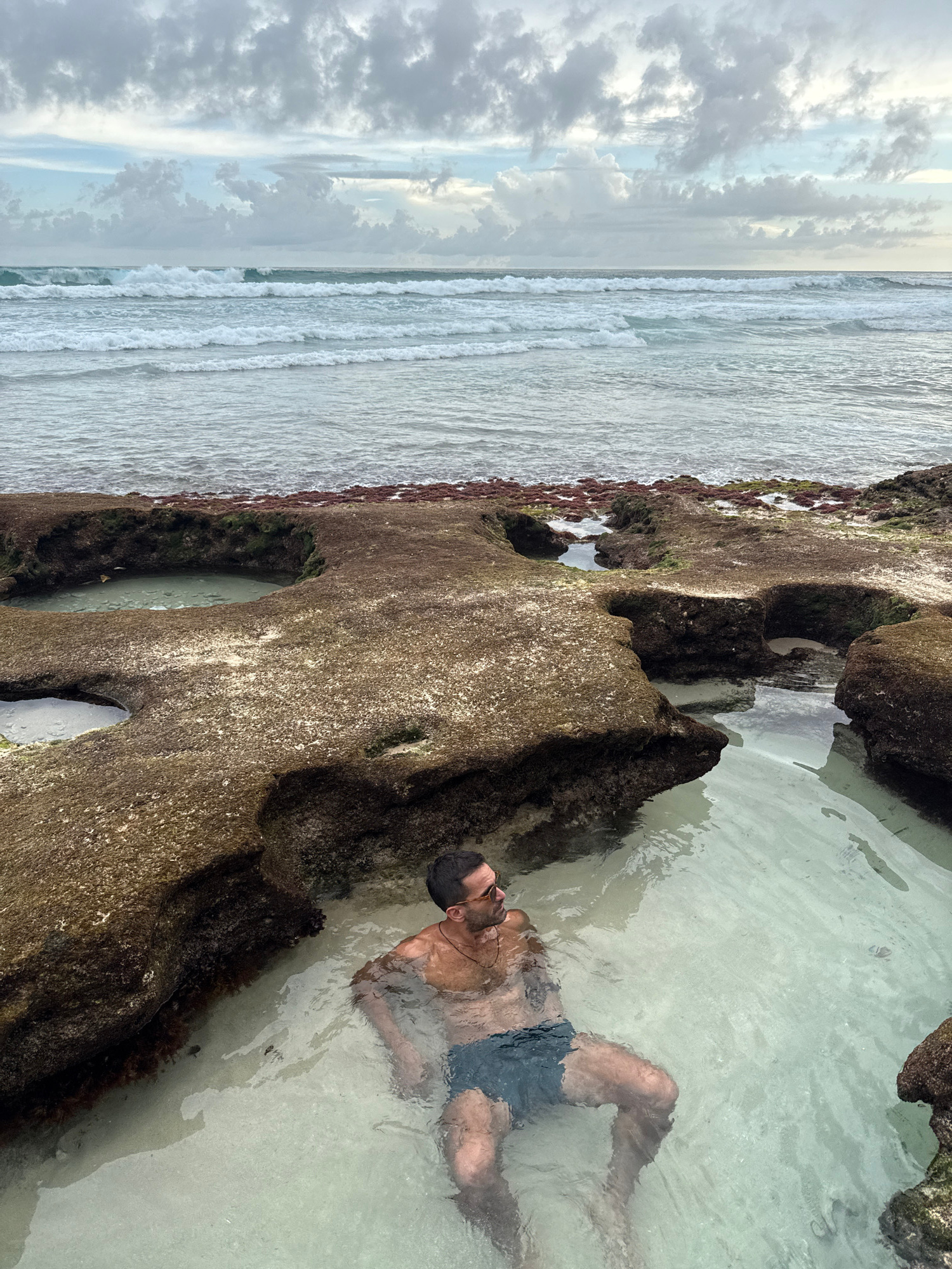 A medium, vertical shot depicts a man floating in a tide pool near the ocean. The location is the city of Pecatu, Indonesia. The sky is overcast. The ocean waves are visible, rolling onto a rock-strew…read more