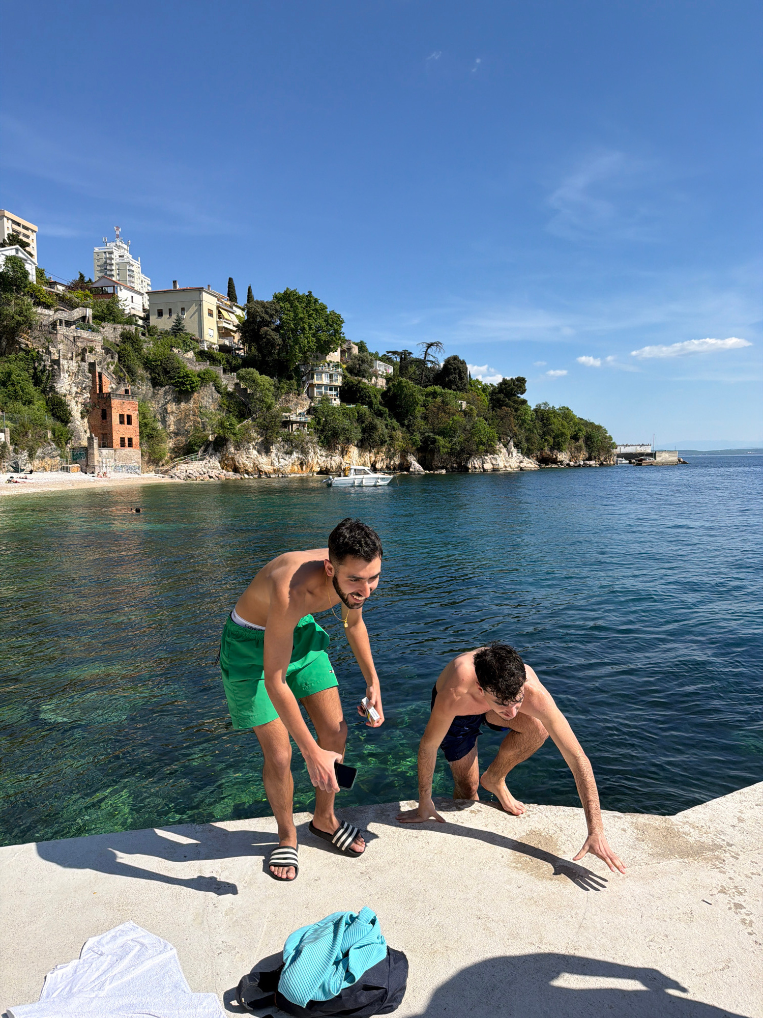 Two men are seated on a concrete pier overlooking the sea in Rijeka, Croatia. The man on the left wears green shorts and black and white sandals and holds a phone in his hand. The man on the right wea…read more