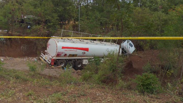 The scene depicts the aftermath of a commercial vehicle accident in Moshi, Tanzania, characterized by dense vegetation and reddish-brown soil. A white fuel tanker truck is observed off-road, resting i…read more