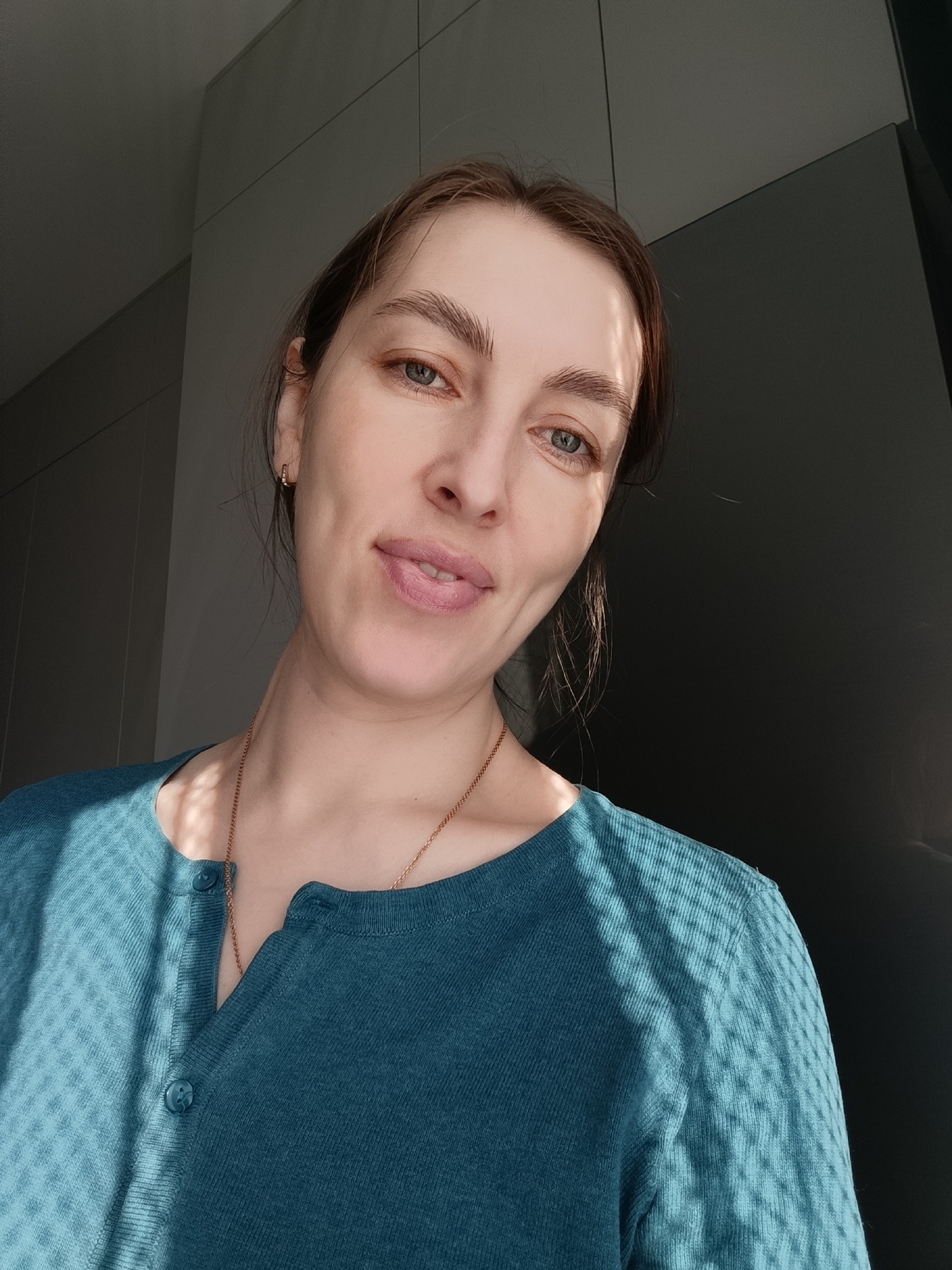A woman is posing for a selfie indoors. She has brown hair and light blue eyes. She is wearing a teal blue cardigan with buttons and a gold chain necklace. There is light falling across her shirt in a…read more