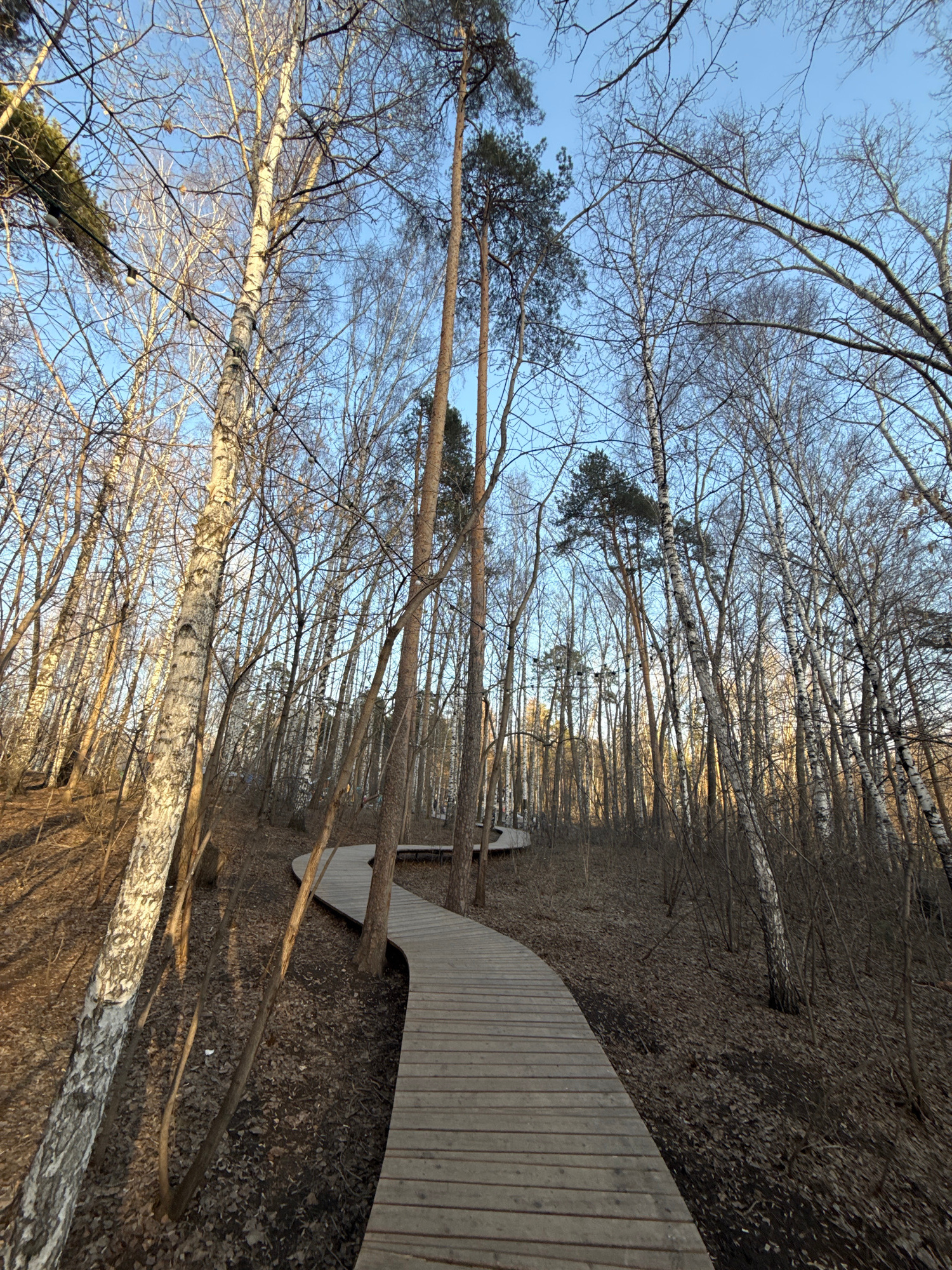 The image shows a wooden walkway in a forest setting. Tall, slender trees, predominantly birches identifiable by their white bark, line both sides of the path. Most trees lack leaves, suggesting it's…read more