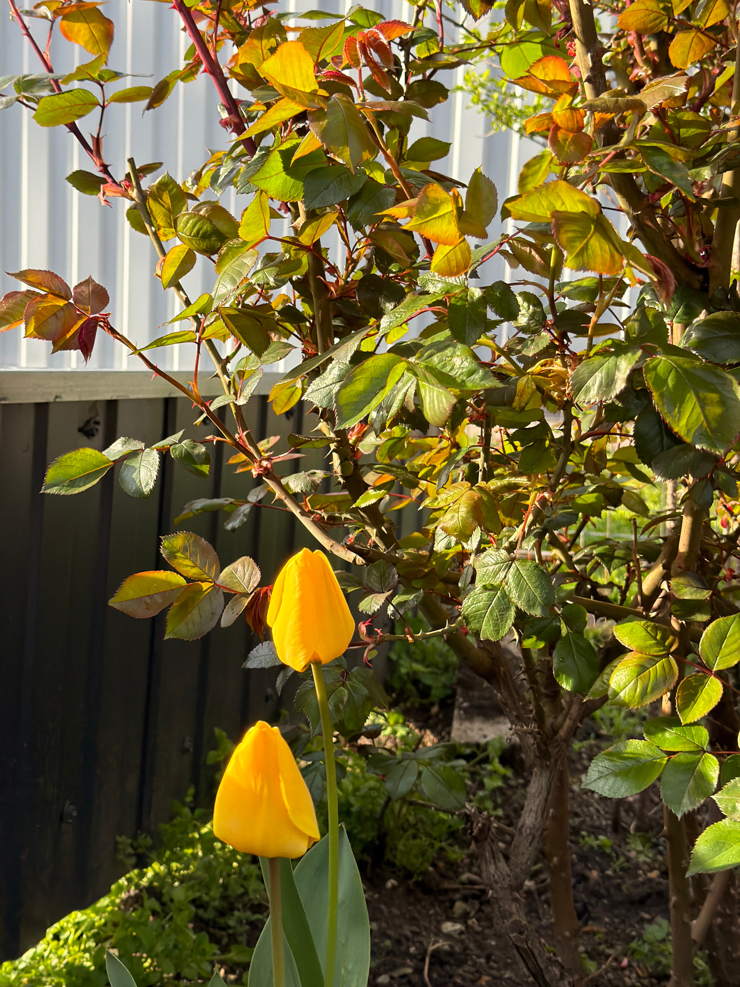 The image depicts a close-up shot of foliage, branches, and two yellow tulip flowers. The leaves exhibit varying shades of green, yellow, and red, suggesting differing stages of growth or seasonal cha…read more
