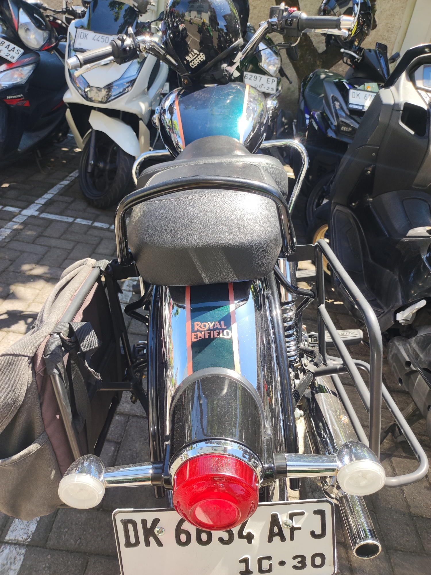 The image shows the rear of a parked Royal Enfield motorcycle with a blue and chrome finish, identifiable by the "ROYAL ENFIELD" logo. It has a black leather seat and luggage racks. A black backpack i…read more