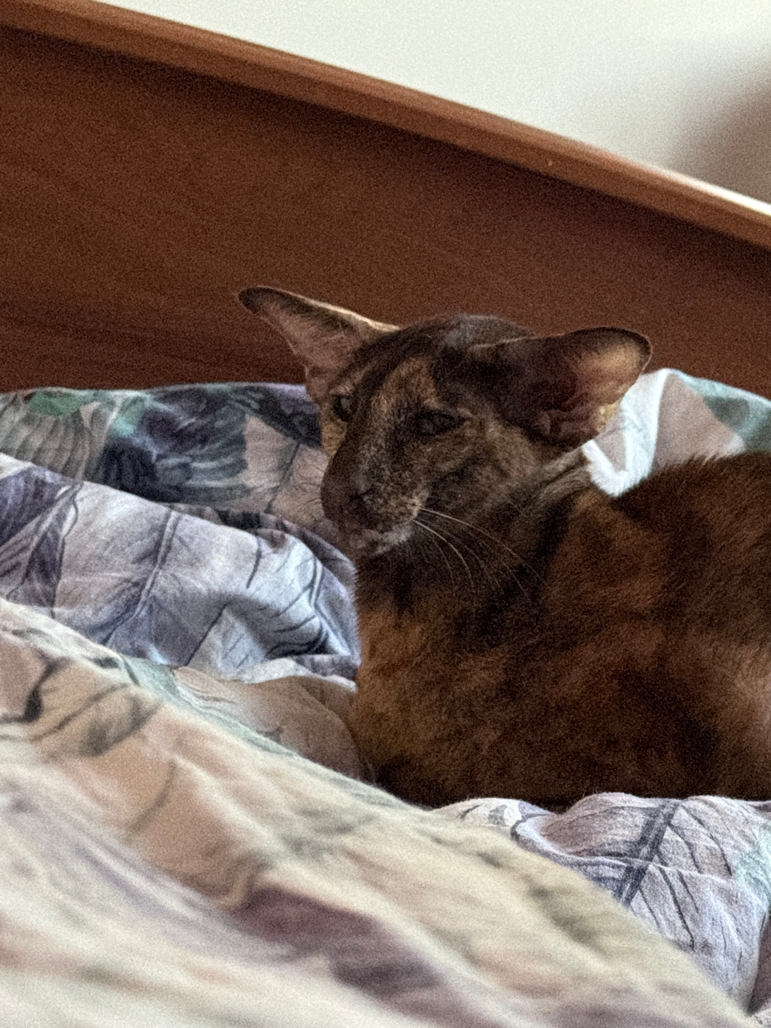 An indoor shot captures a tortoiseshell or calico cat nestled within patterned bedding or blankets, viewed from a slightly elevated perspective. The cat, predominantly dark brown with lighter patches and distinct facial markings, is the primary subject, occupying the upper right and central-left portions of the frame. Its head is tilted downwards and to the left, with one ear prominently visible, showcasing fine whiskers. The cat is surrounded by soft, rumpled textiles. To the cat's right, the bedding features a light blue and grey pattern with dark, abstract lines and shapes. Further to the right, another section of bedding is a lighter beige or off-white color, also patterned, suggesting a cozy environment. To the left of the cat, a brown, textured wooden surface is visible, likely a piece of furniture such as a headboard or closet door, creating a warm contrast with the lighter background behind it. The activity appears to be the cat resting or perhaps observing something below its line of sight. The overall scene conveys a sense of quietude and domestic comfort. The image exhibits noticeable digital noise or grain. No specific time of day or weather can be discerned, and there are no discernible location cues within the image itself, other than the provided context of Chaikovsky, Russia. There is no visible text. | Open Wire
