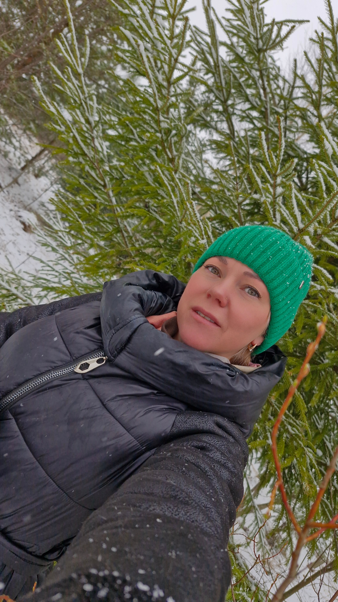 A woman is captured in a close-up, upward-angled shot, posing outdoors in a snowy, wintery setting in Otchor, Russia. She wears a vibrant green knitted beanie and a black quilted puffer jacket with a…read more