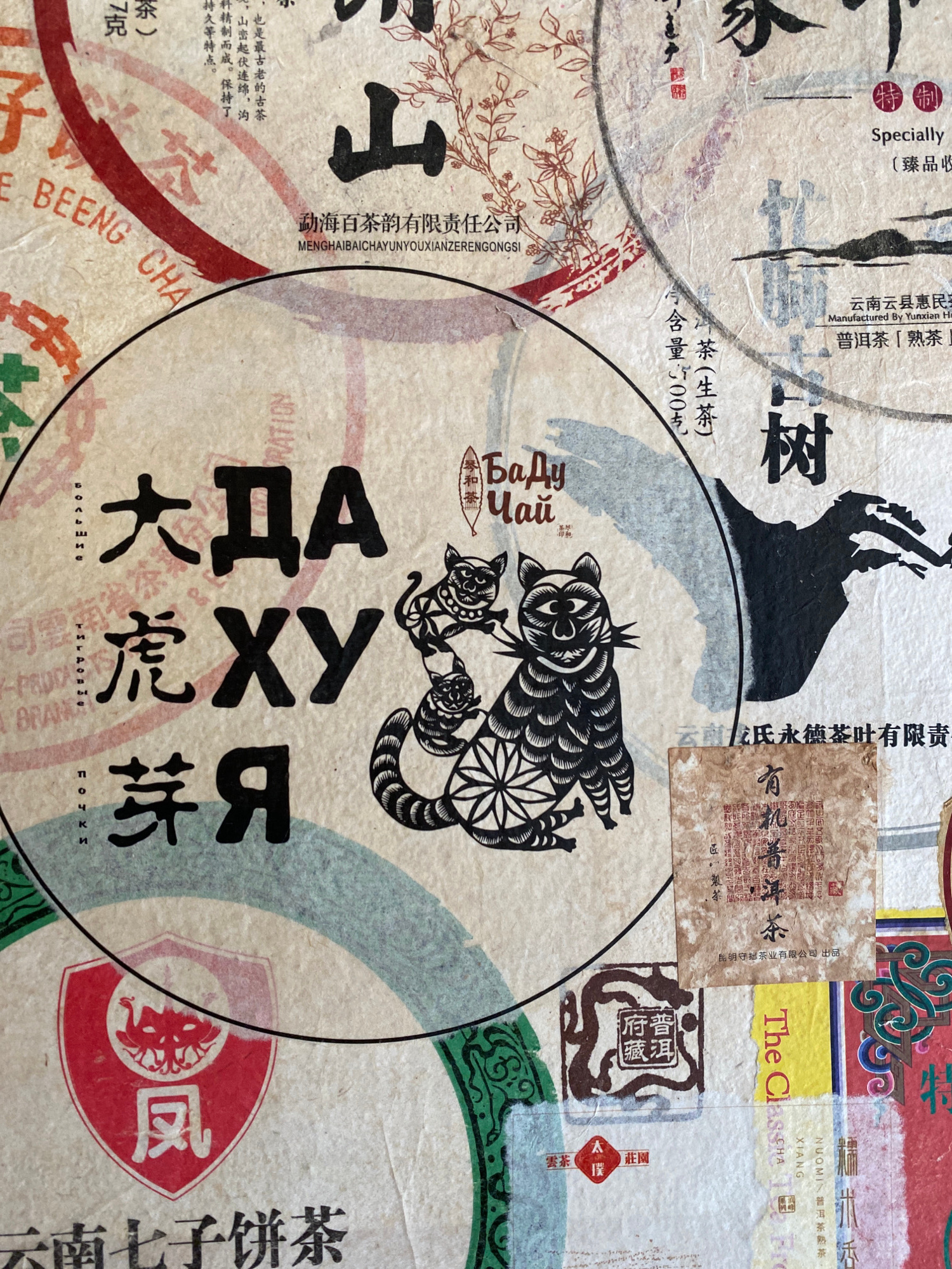 The image is a close-up of a collage featuring various tea-related labels, symbols, and Chinese characters on what appears to be textured paper. At the center is a circle with a black and white illustβ¦read more