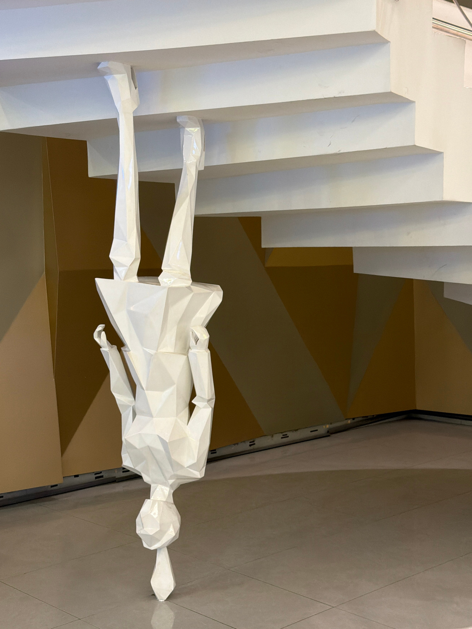 An inverted, white, geometric polygonal sculpture of a human figure is centrally positioned indoors in Kuala Lumpur, Malaysia. The sculpture's feet are securely affixed to the smooth underside of a wh…read more