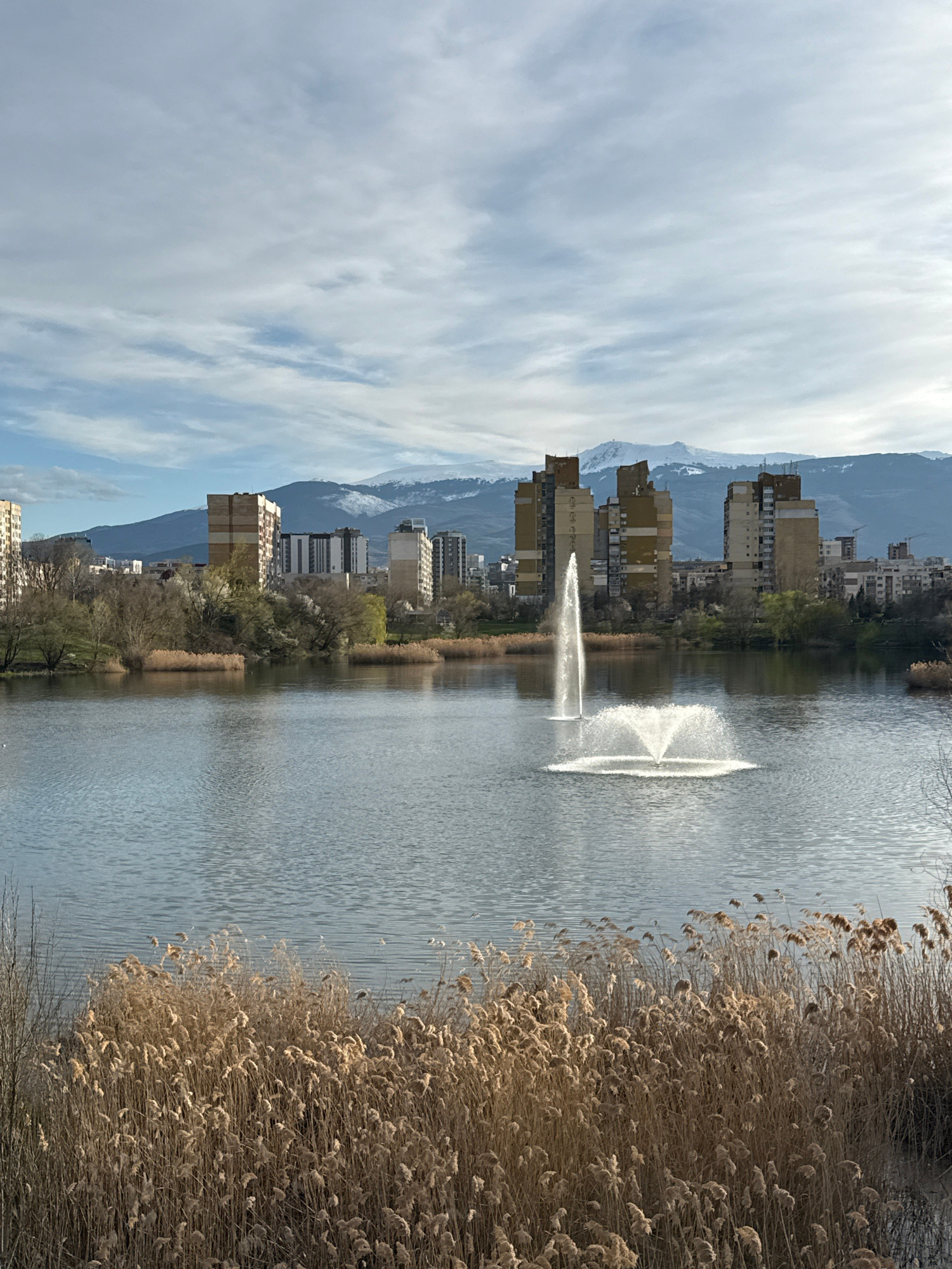 The image depicts a lake in Sofia, Bulgaria, likely Lake Ariana, with a fountain spraying water in the center. Tall buildings line the shore, and the Vitosha Mountains are visible in the background. R…read more
