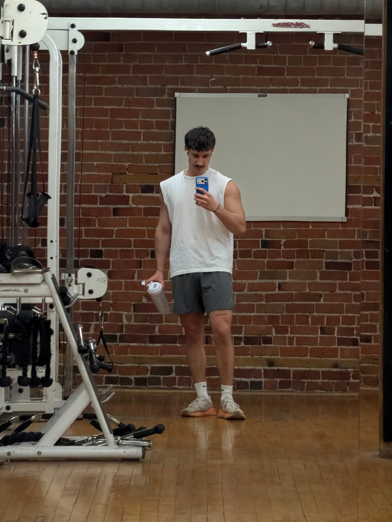 A person is standing indoors next to a weight machine. The person is wearing a white tank top, gray shorts, white socks, and white sneakers. They are holding a blue smartphone in their left hand and a…read more