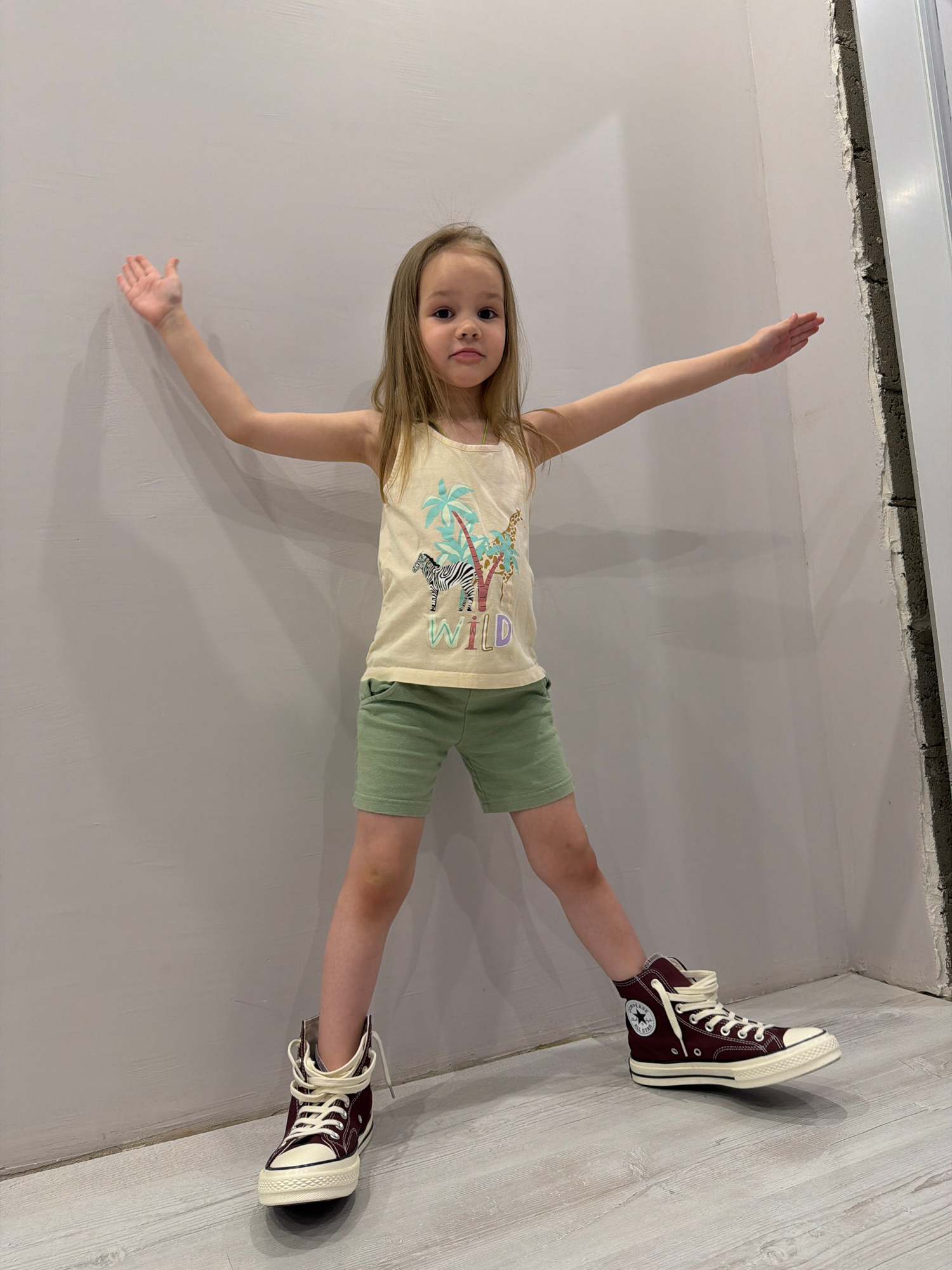 A young girl is depicted indoors, playfully posing in what appears to be a corner of a room in Chaikovsky, Russia. The image is oriented sideways, making it look as though she is standing horizontallyโฆread more
