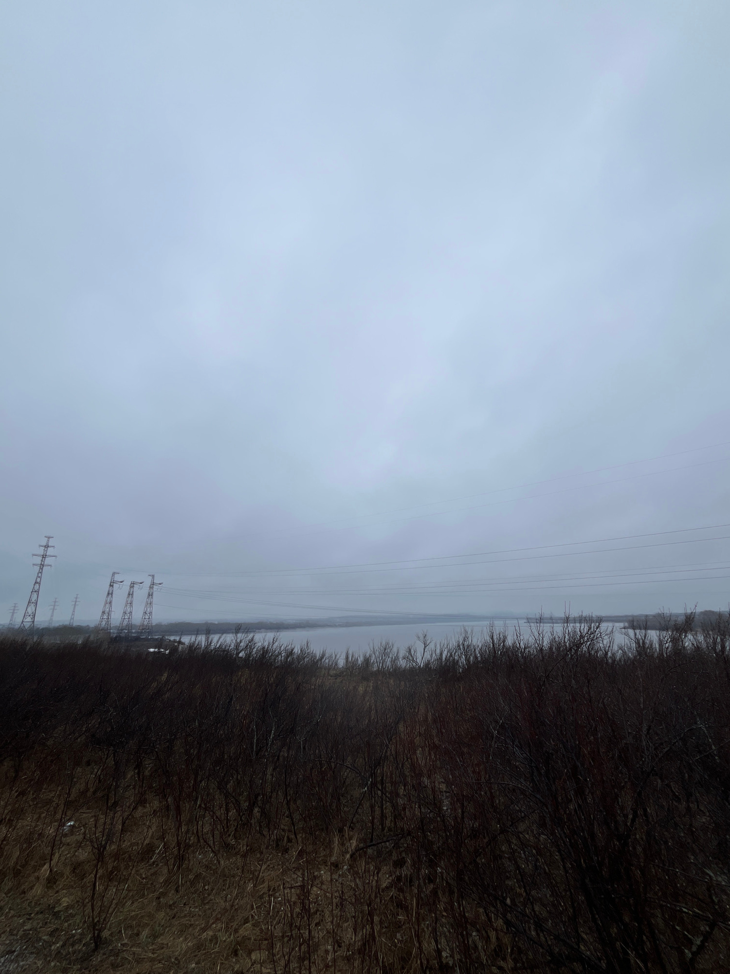 The image displays a bleak, wide-angle outdoor landscape under an overcast sky in what appears to be late autumn or winter, located in Chaikovsky, Russia. The sky, a uniform light grey, dominates the…read more