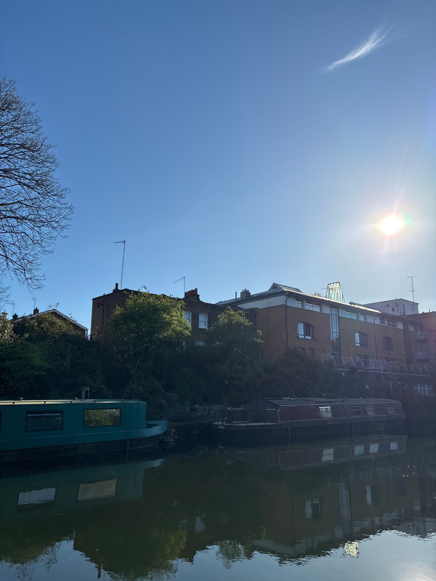 The image depicts a canal in London, United Kingdom, likely Regent's Canal or a similar waterway. The scene is captured on a sunny day, with a bright blue sky and a faint wisp of cloud. Along the cana…read more