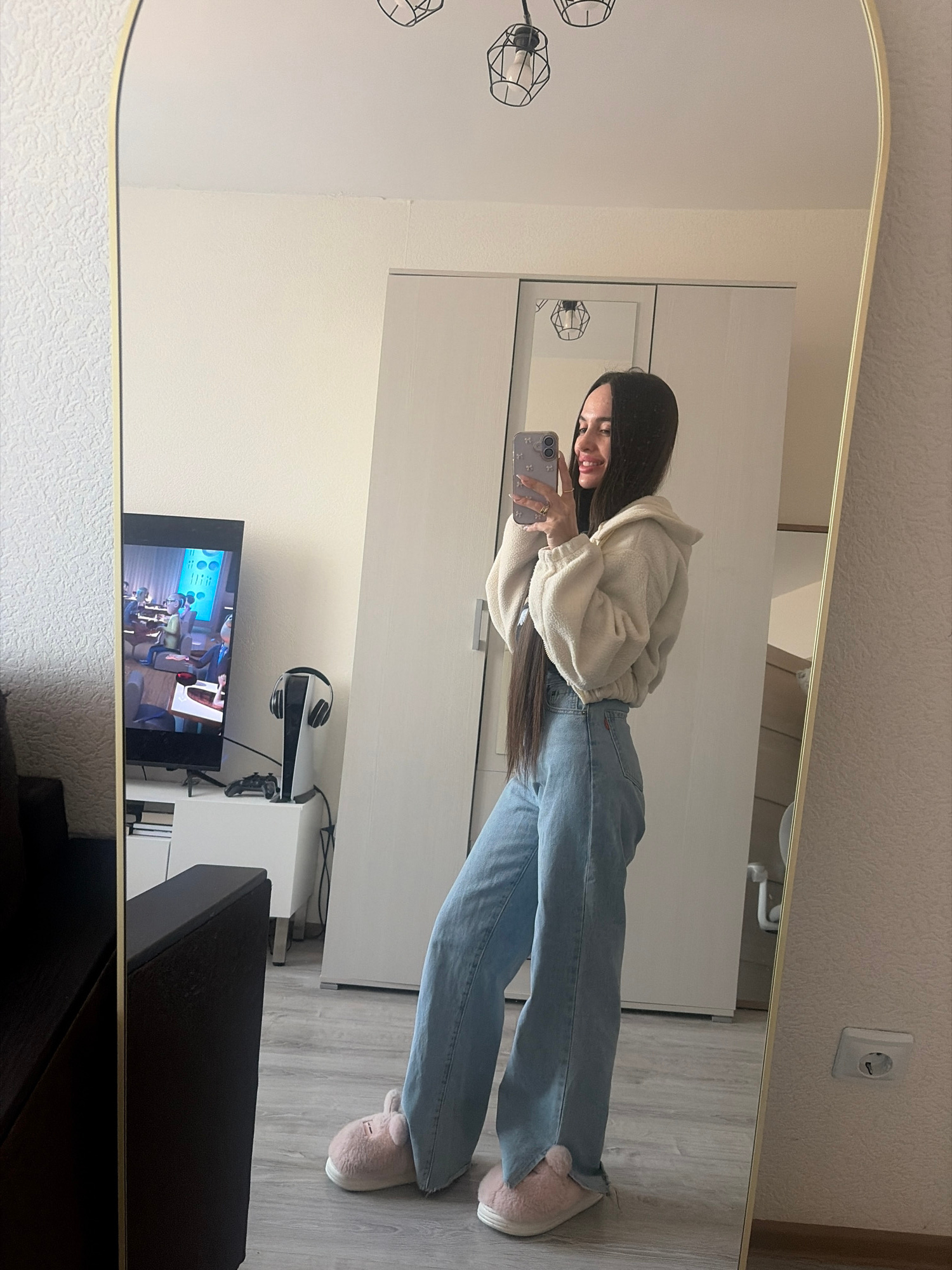 A young woman is taking a selfie in a full-length mirror. She is wearing a cream-colored, fluffy hooded sweatshirt, light blue jeans, and pink furry slippers. She is holding a smartphone in her left h…read more