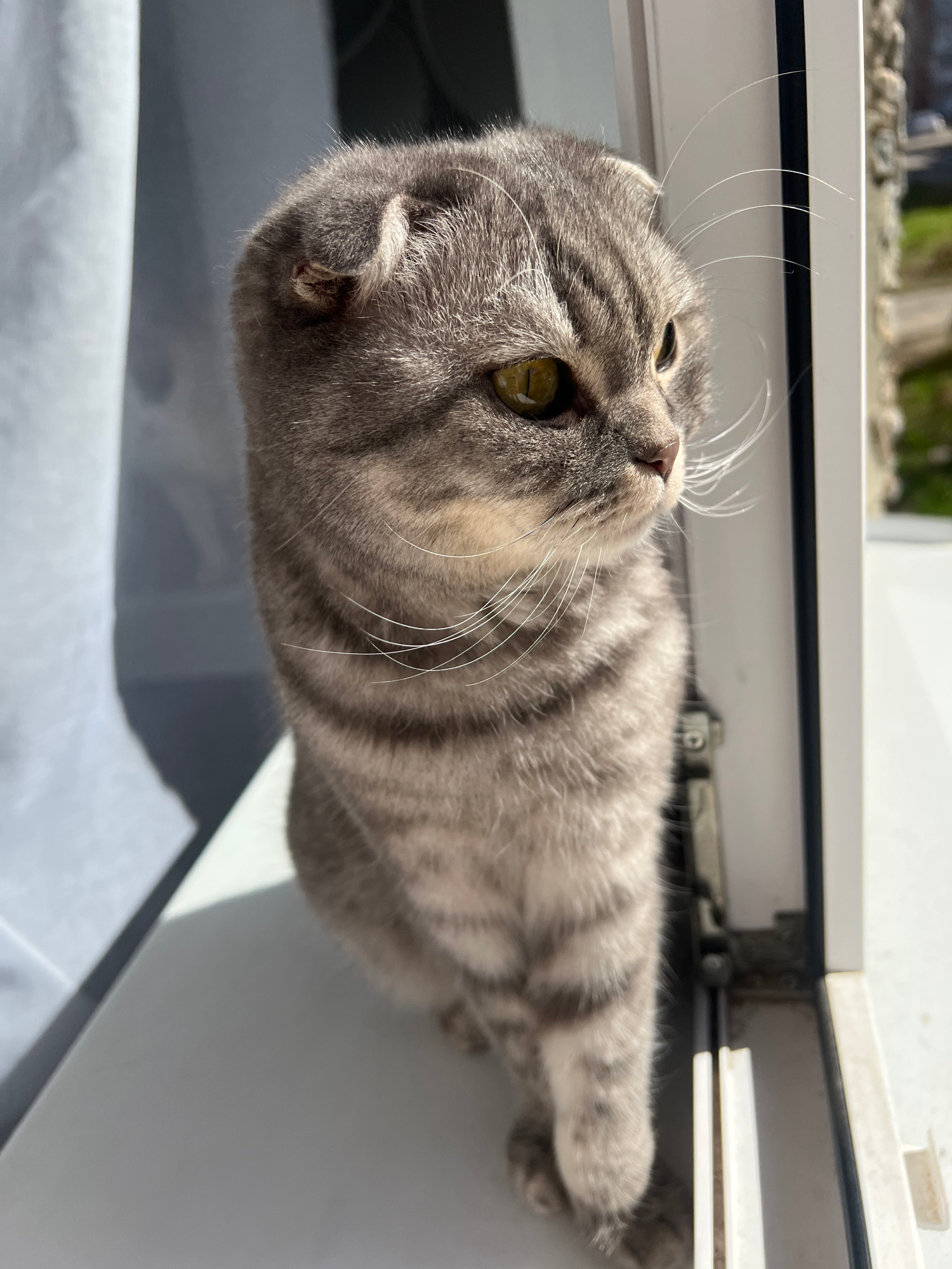 A gray tabby cat with folded ears lies on its side near a window frame. The cat is looking up and towards the light. The scene is indoors, but the specific location in Votkinsk, Russia, is indetermina…read more
