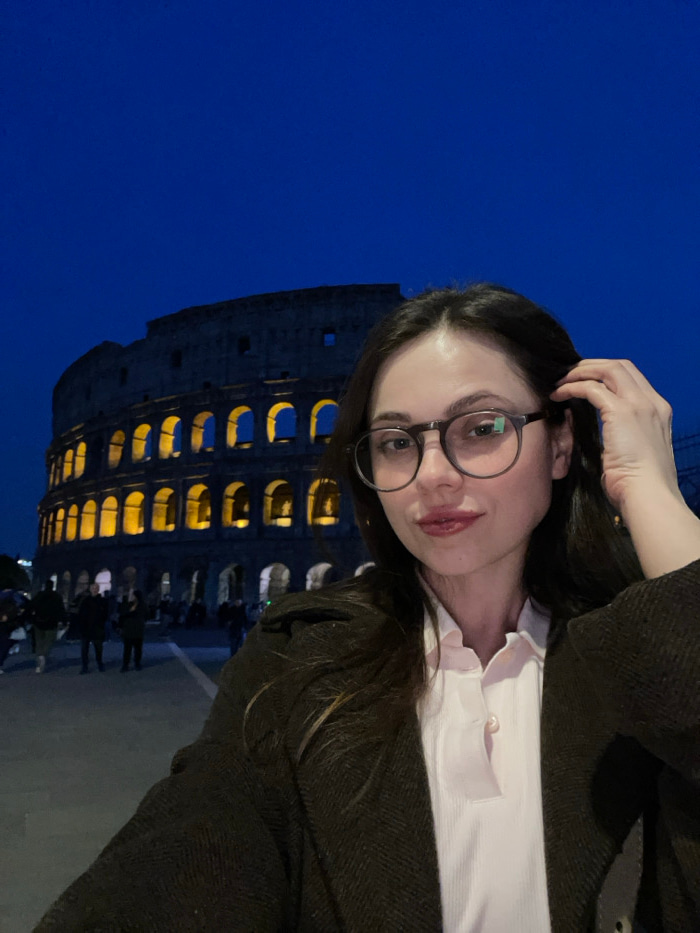 The image depicts a woman in the foreground, taking a selfie, with the Colosseum in Rome, Italy, visible in the background at night or late dusk. The sky is dark blue. The primary subject is a female…read more
