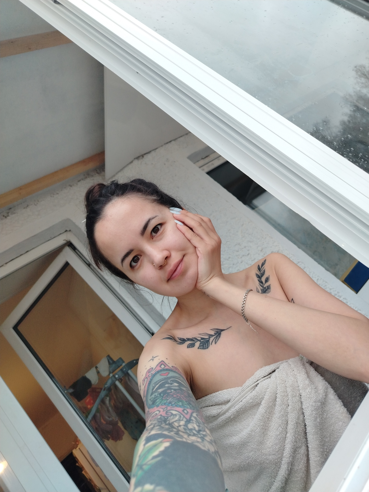 A young woman is featured in a close-up selfie, taken from a slightly low angle, set within what appears to be a domestic space in Noviy, Russia. She has dark hair tied back in a bun and a small hoopβ¦read more