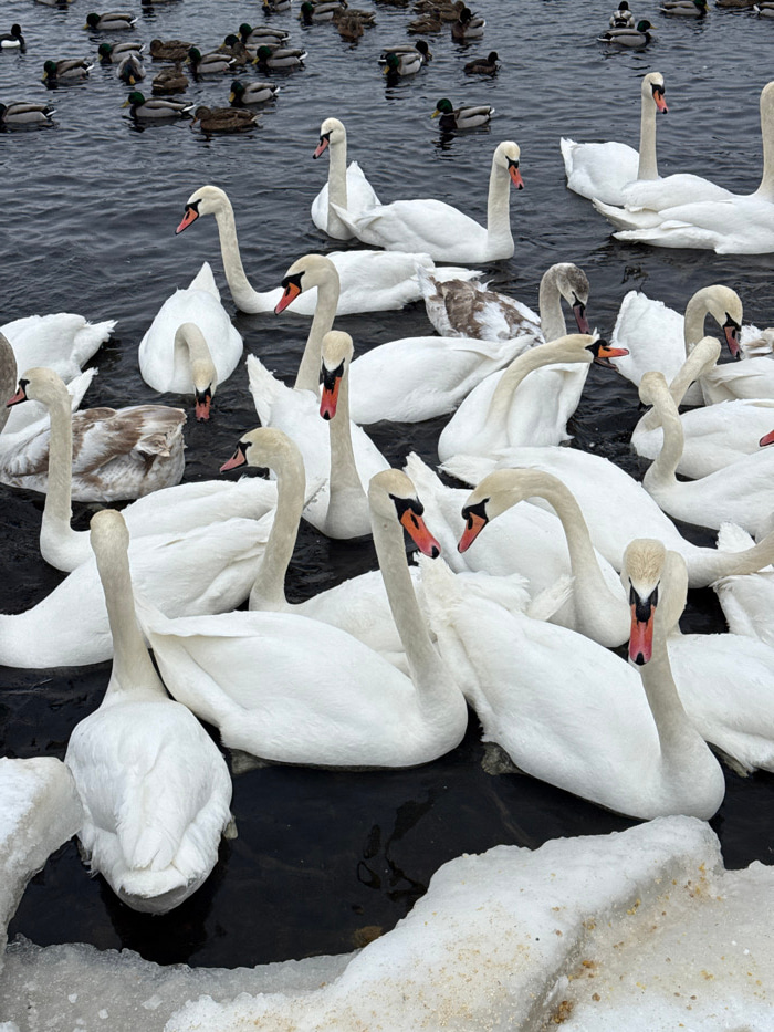 The image depicts a dense congregation of water birds on a dark body of water, partially bordered by dirty ice, consistent with a winter scene on the Dnipro River or one of its connected lakes or bays…read more