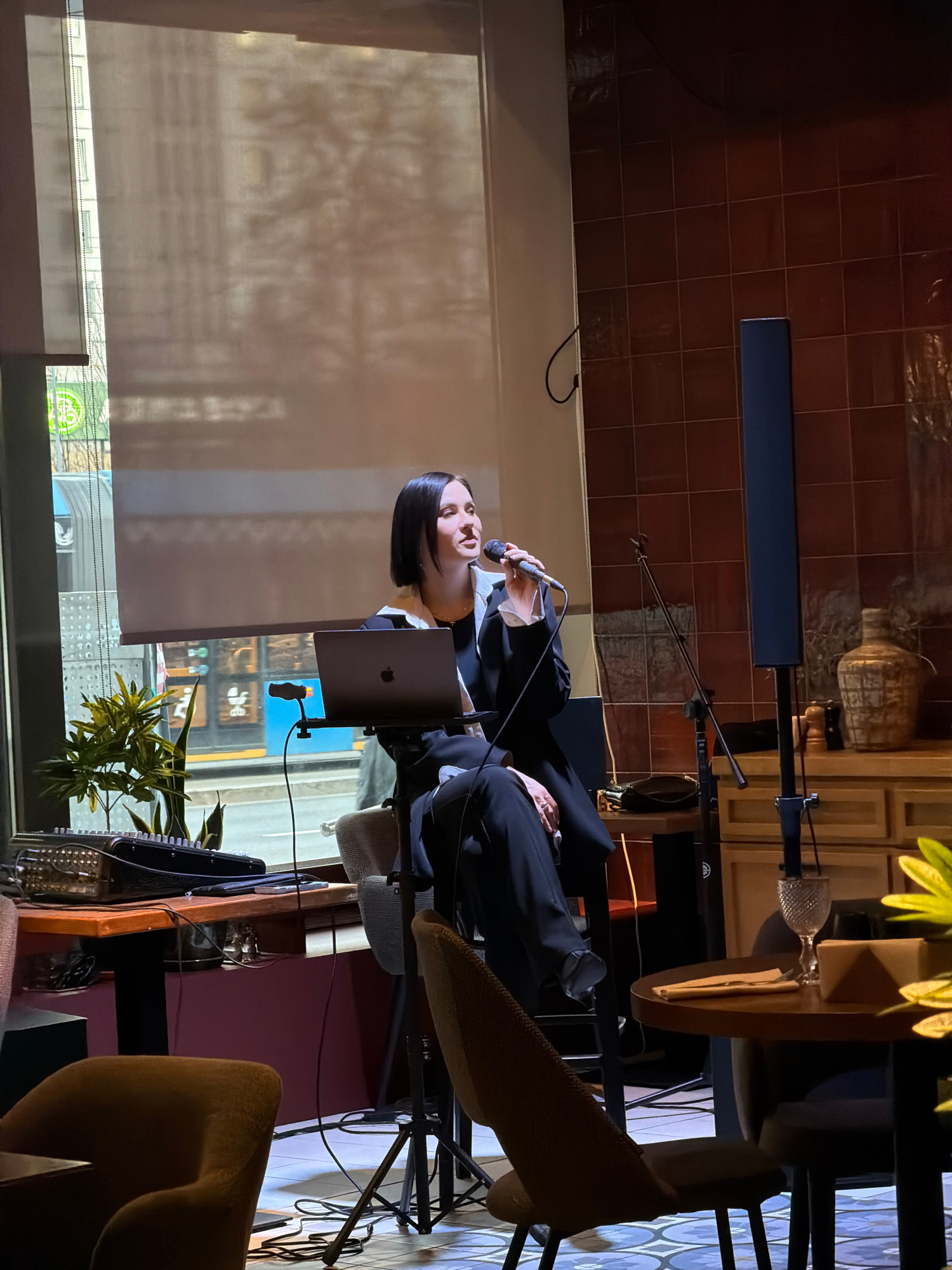 A woman in a dark blazer and white shirt is giving a presentation or performance. She is holding a microphone and standing behind a laptop computer, which is positioned near a window. The window proviβ¦read more