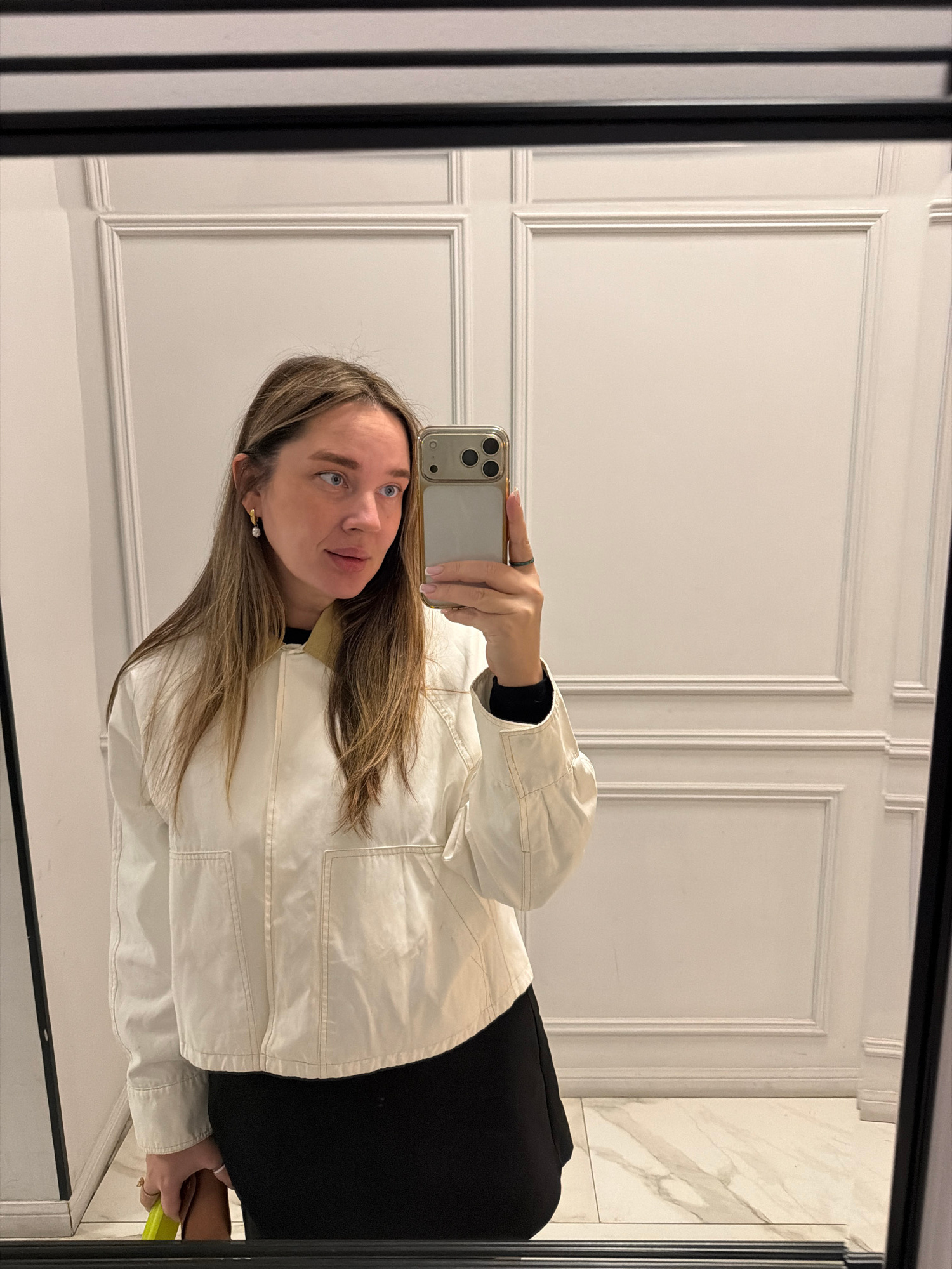 A woman is taking a selfie in a mirror. The mirror frame is black. The wall behind the woman and mirror has a lower portion with light marble tile. Above the marble, the wall is white with raised rect…read more