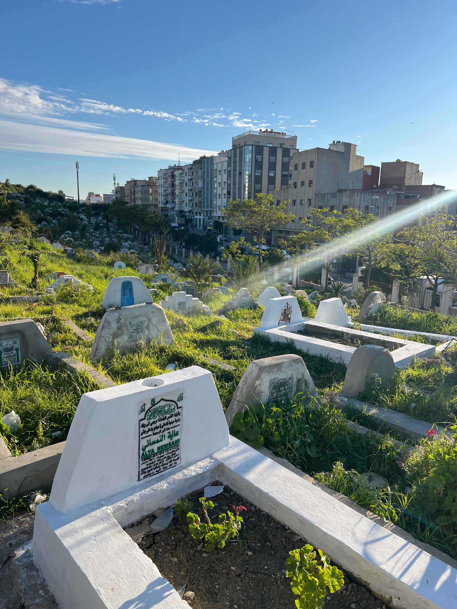 The image depicts a section of a cemetery, likely the Muslim cemetery of Sidi Amar in Tangier, Morocco, given the style of the headstones and the Arabic inscriptions. The cemetery is located on a hillside, with buildings visible in the background, indicating an urban setting. The headstones are predominantly white, with some featuring inscriptions in Arabic. There is lush green vegetation growing among the graves. The sky is blue with some clouds, and a bright light, potentially the sun, is visible. A close-up gravestone is in the forefront of the picture, which is surrounded by a white border, has an Arabic inscription, and the name "ALYA NEMSANI" with birth and death dates. | Open Wire
