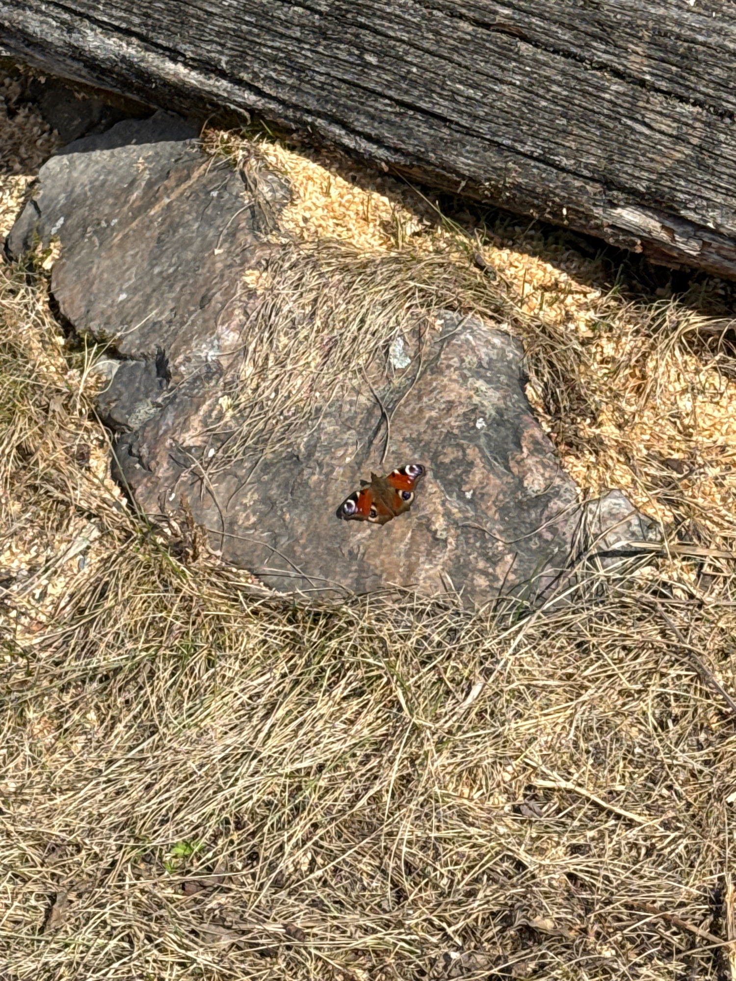 The scene is a close-up, outdoor shot. A European peacock butterfly (Aglais io) rests on a grey rock that is surrounded by dry, beige grass and hay. A piece of dark, weathered wood is visible on the l…read more