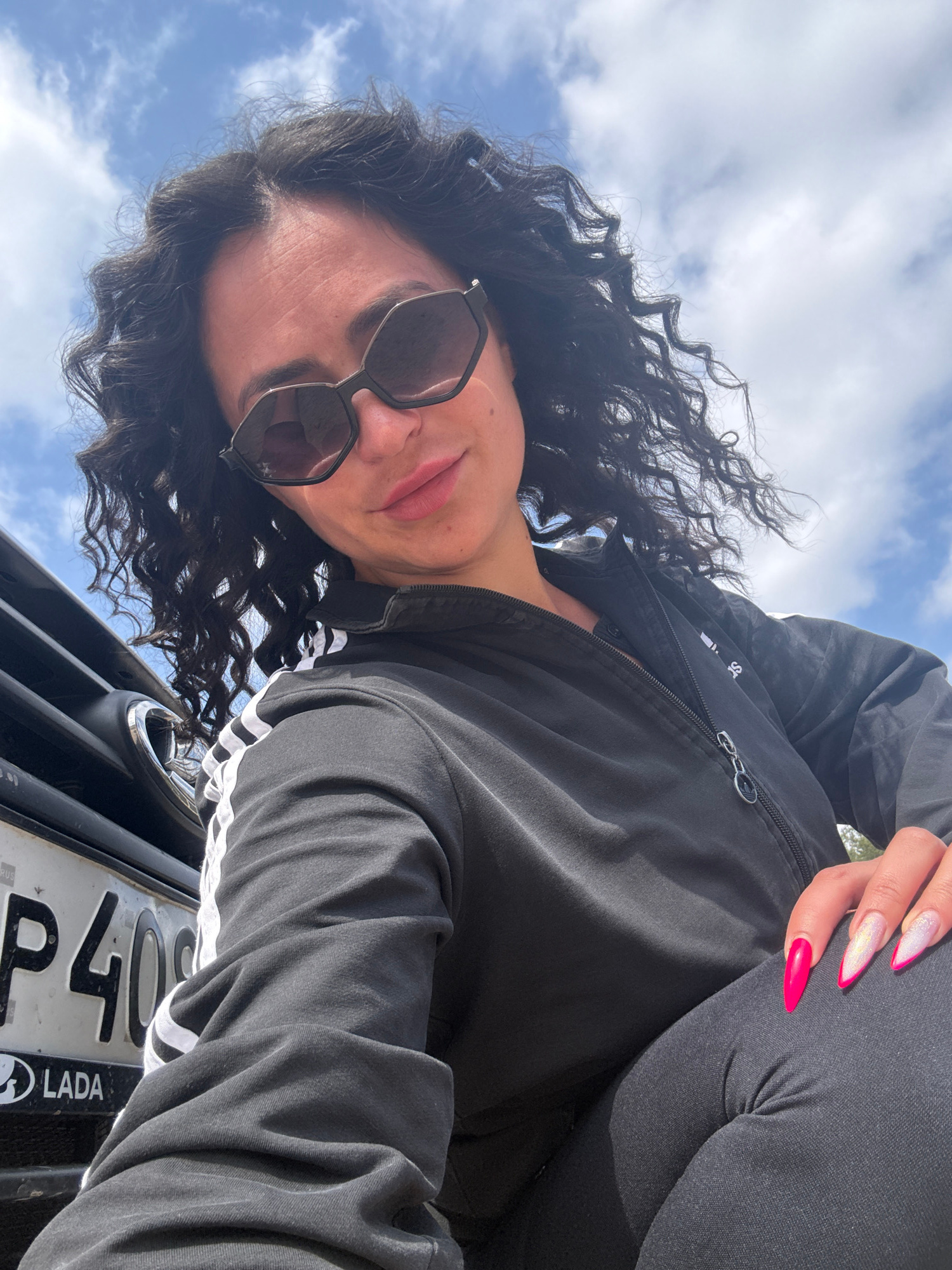 A low-angle, rotated portrait captures a person looking towards the camera against a bright, cloudy sky. The subject, likely female, has dark, curly hair and wears dark, hexagonal-framed sunglasses. H…read more