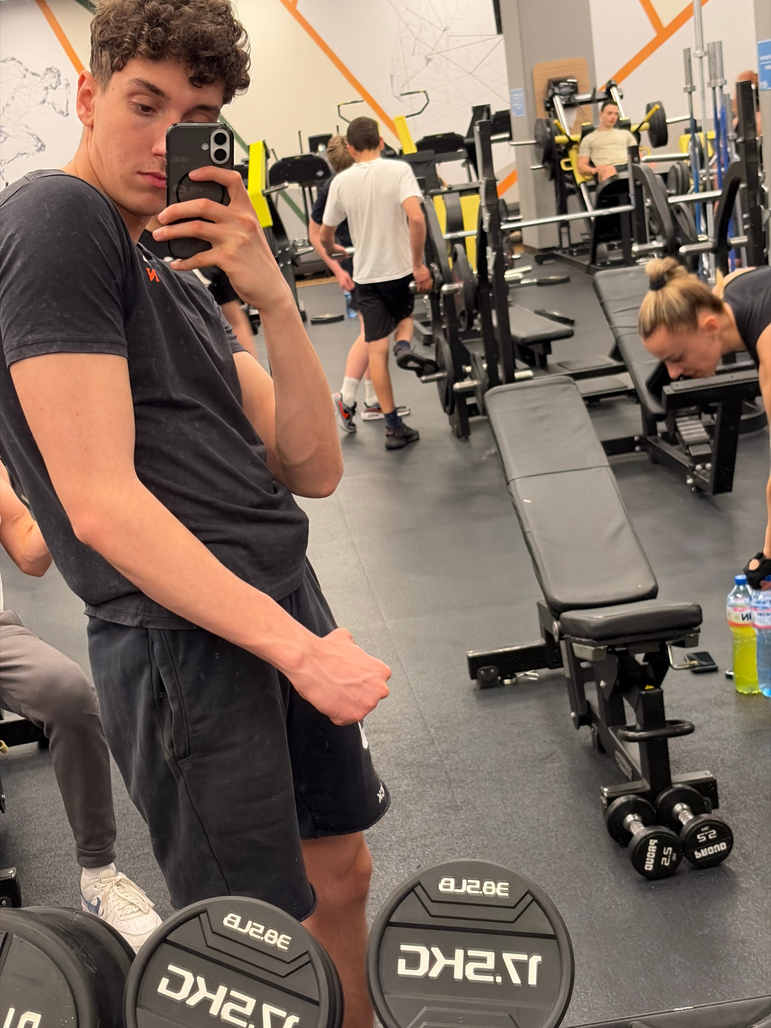 The image shows a selfie taken inside a gym. A young man with curly hair is holding a smartphone, presumably to take the picture. He is wearing a dark t-shirt and black shorts. Two large weight platesβ¦read more