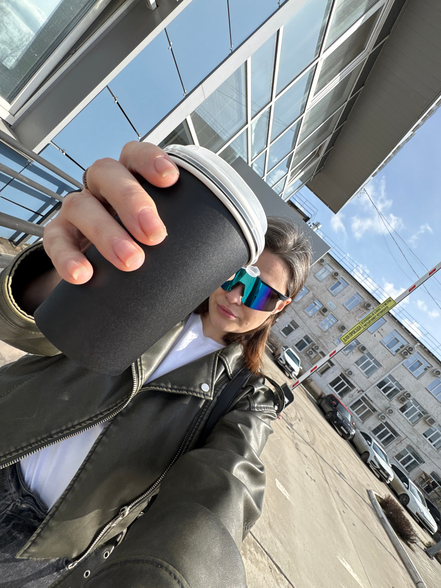 A woman holds a black coffee cup in a selfie in what appears to be an urban setting in Chaikovsky, Russia. The location is suggested by the yellow sign in the background, which features Russian text.…read more
