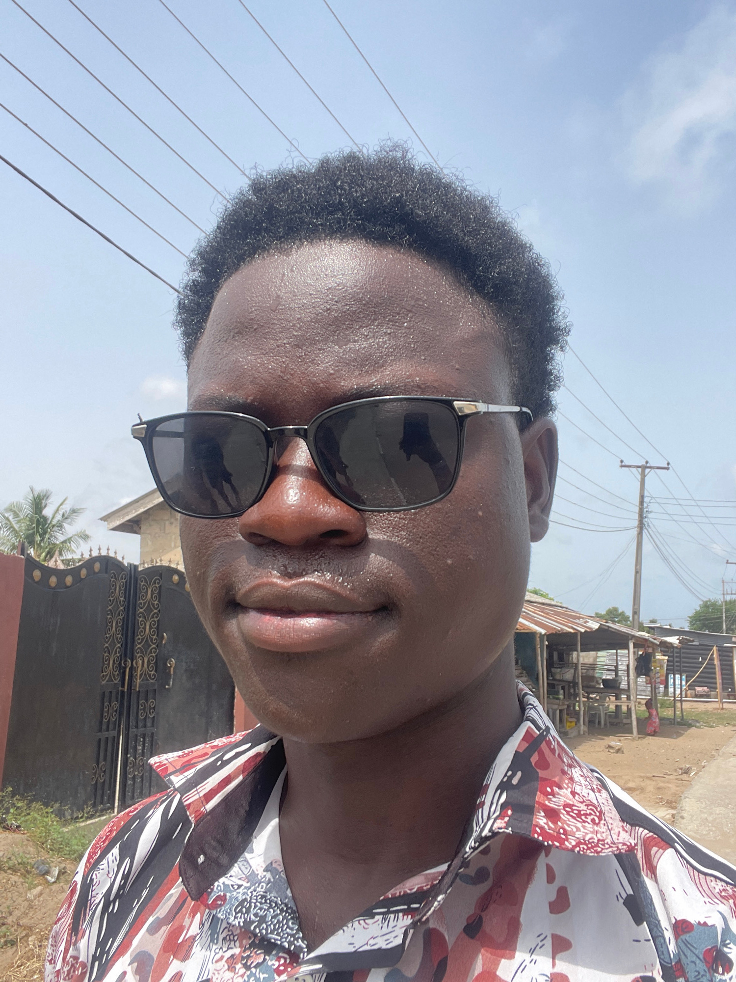 A close-up, rotated portrait shows a dark-skinned individual wearing sunglasses and a patterned shirt. In the background, utility poles with wires are visible against a light blue sky. Also present is…read more