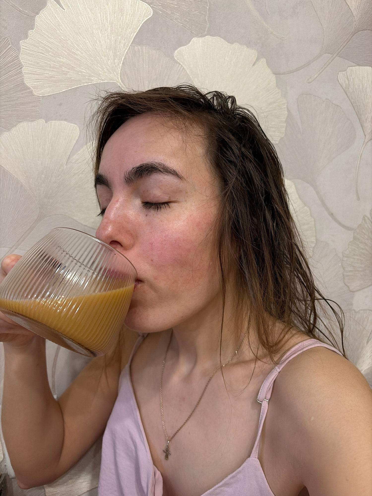 A young woman is lying down and drinking from a clear glass with a light brown liquid inside. She has dark hair and is wearing a light pink tank top and a necklace with a small cross. Her eyes are clo…read more