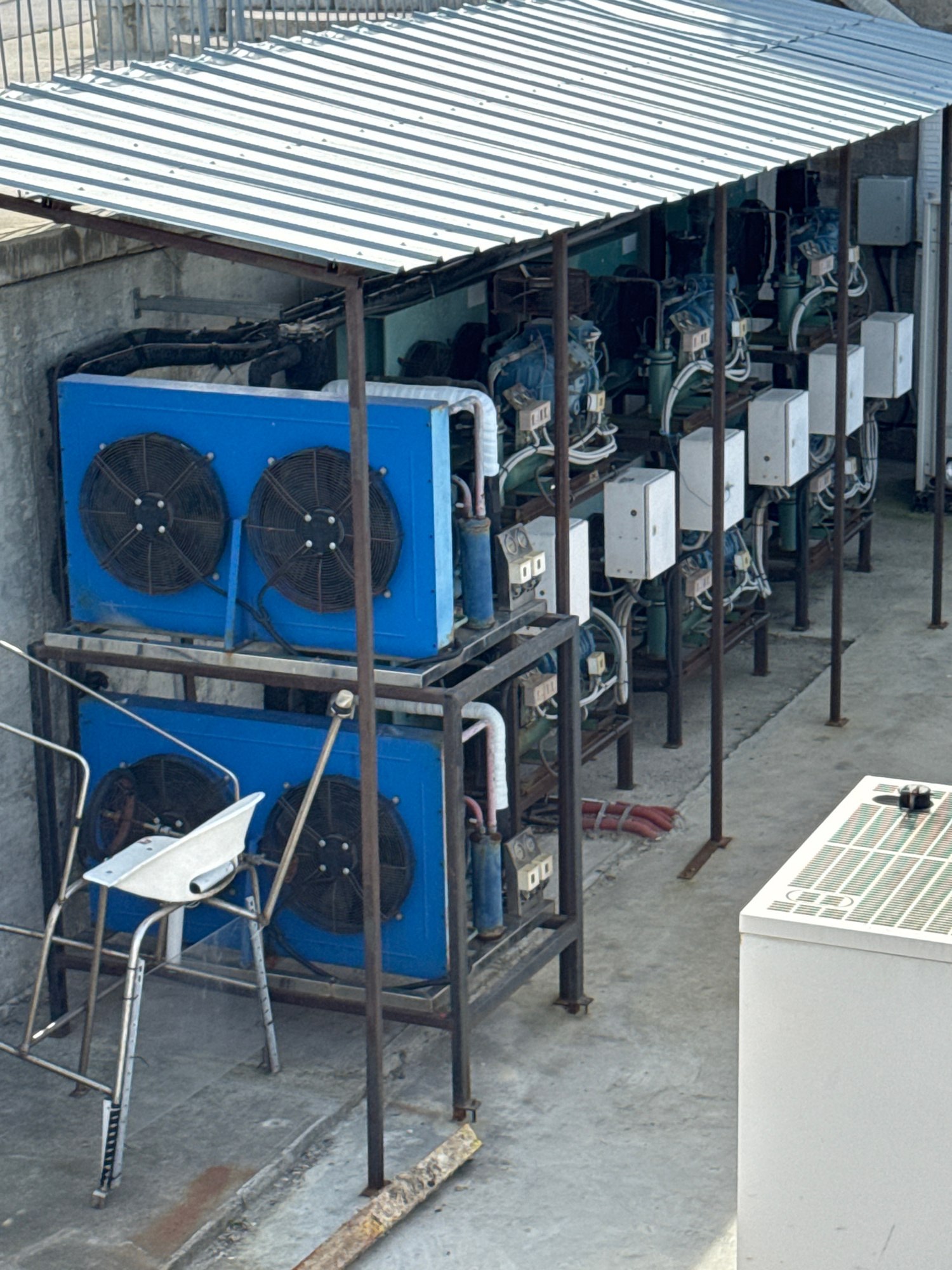 The image displays an extensive array of industrial machinery situated outdoors on a concrete surface, likely a rooftop or an elevated service platform, viewed from an overhead perspective. The origin…read more