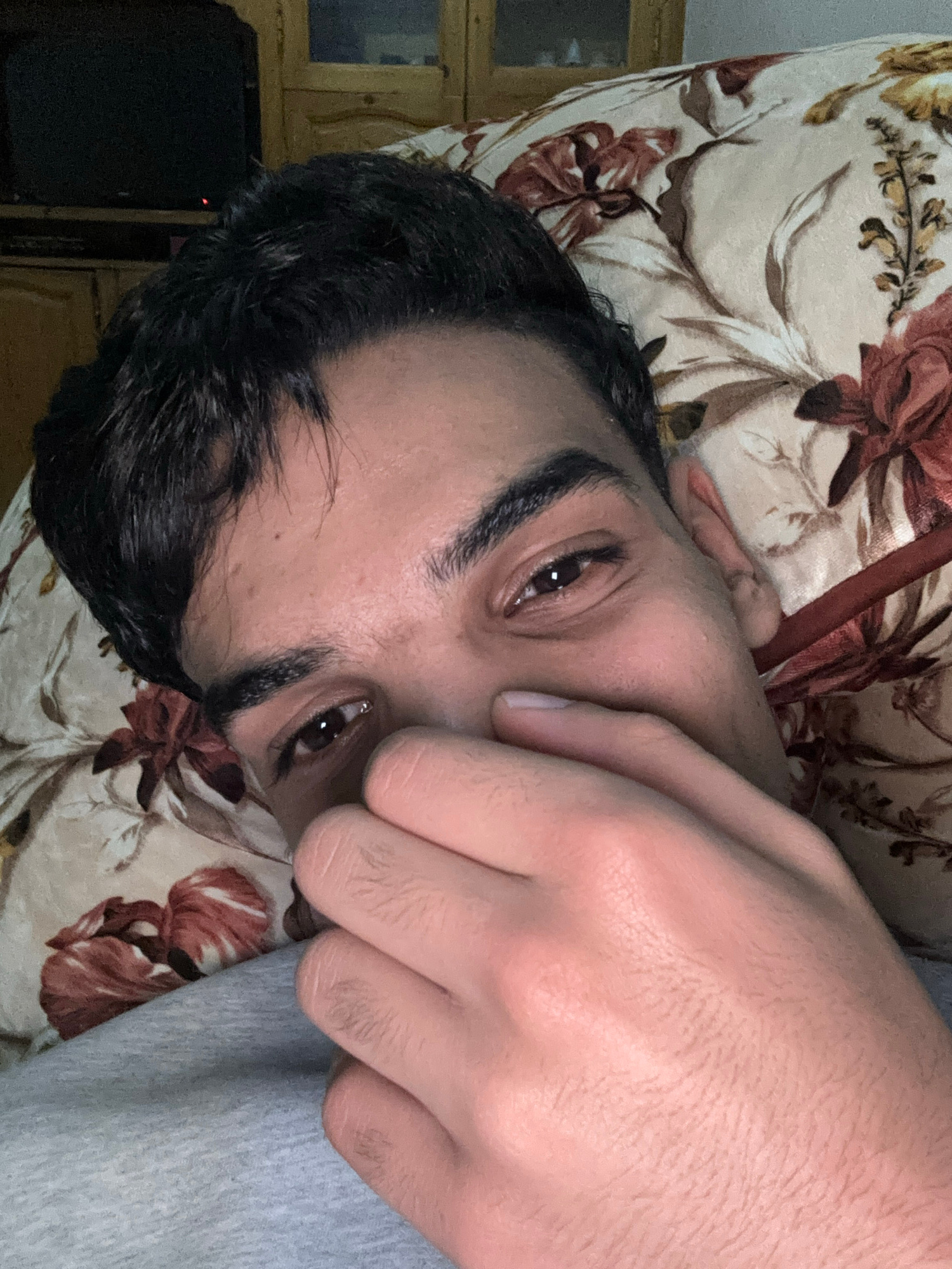 A close-up, high-angle shot depicts a man lying on a floral patterned surface, possibly a bed or couch. He is positioned such that his face is mostly obscured by his hand, which is held up to his nose…read more