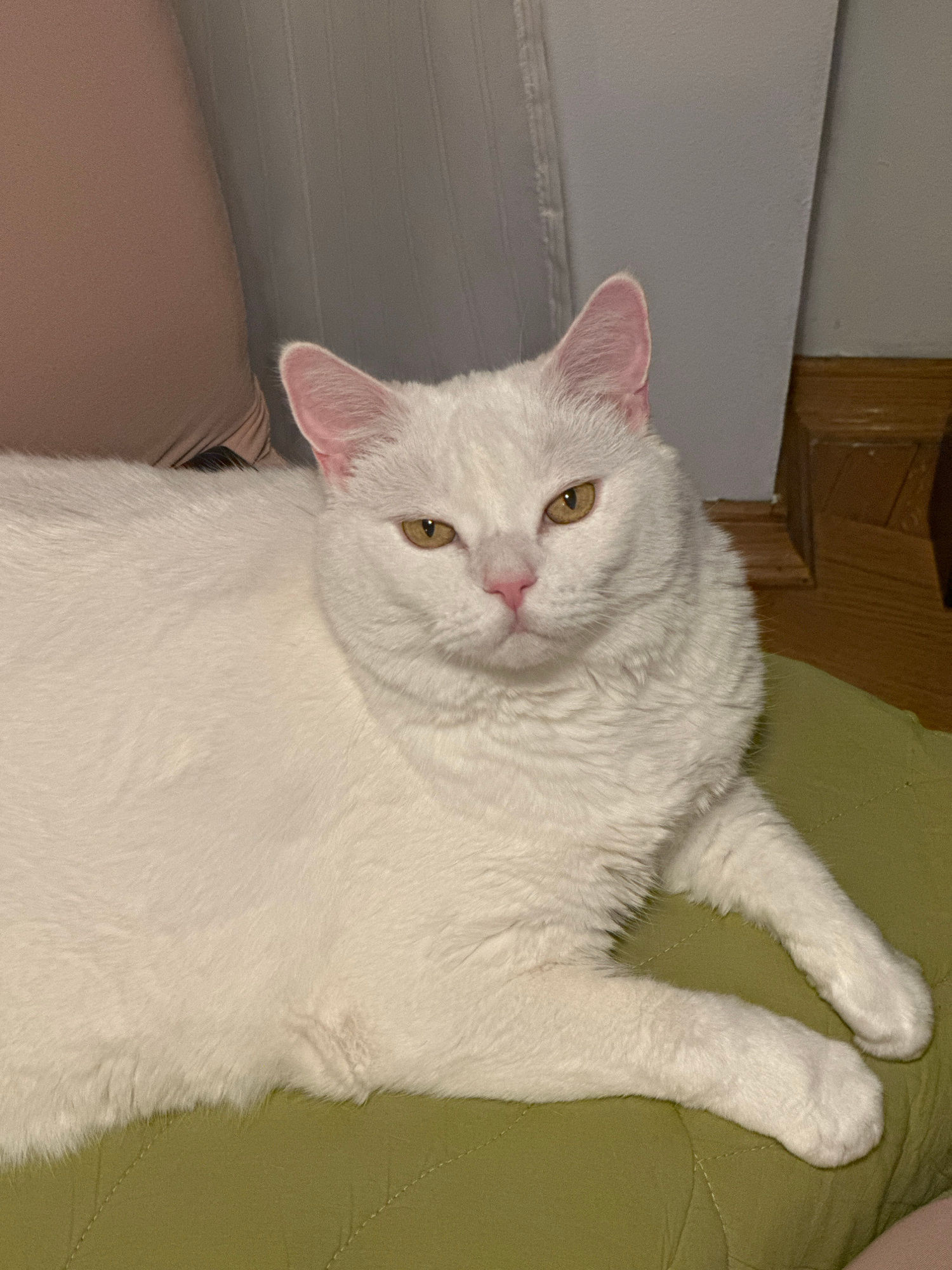 A white cat with light brown eyes lies on a light green quilted surface, possibly a blanket or cushion. The cat is positioned towards the left of the frame, with its head tilted to face the camera. It…read more