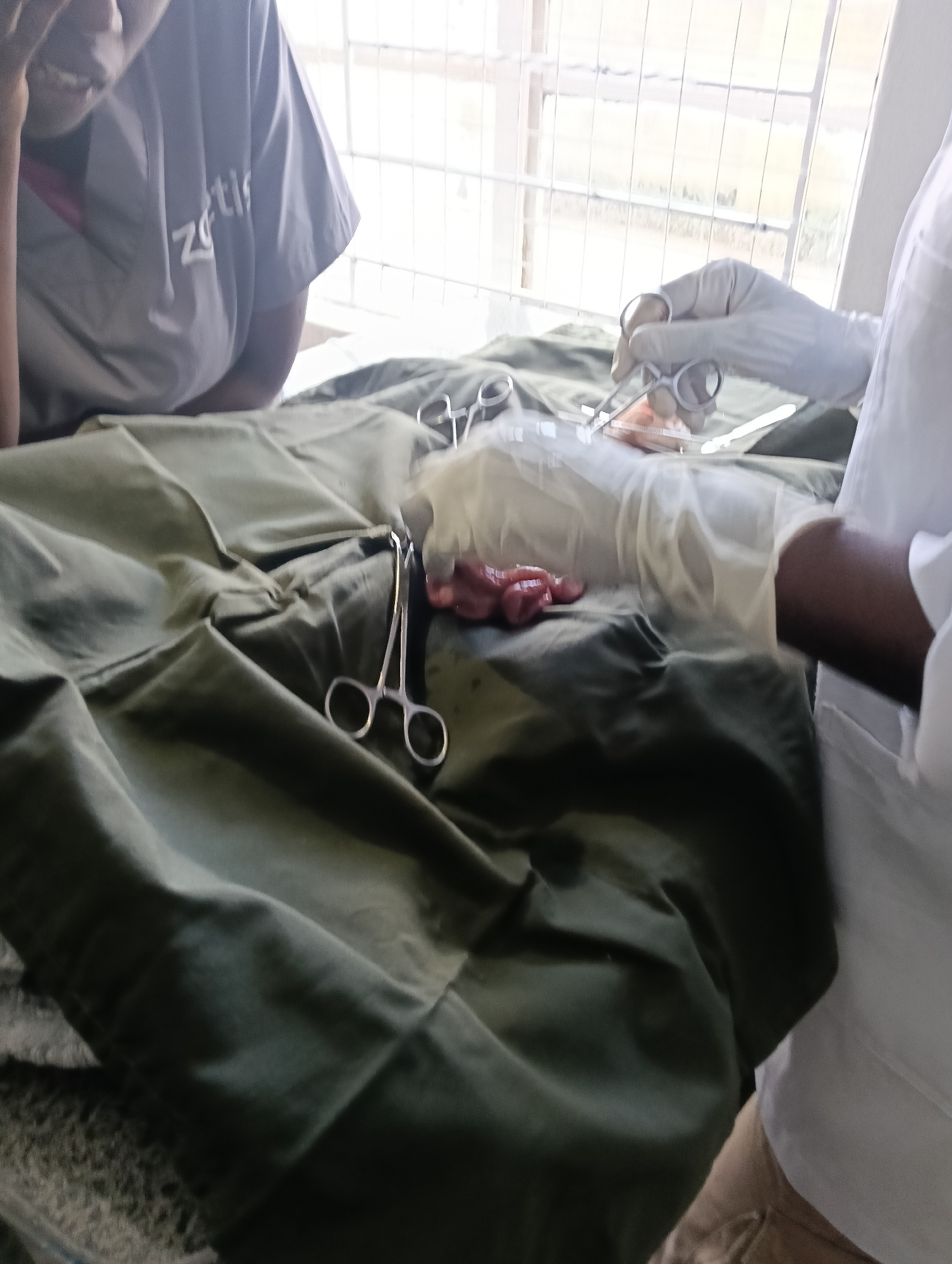 The image depicts an indoor medical or laboratory setting, consistent with a veterinary or animal health facility in Nairobi, Kenya. Two individuals are partially visible. On the left, a person wearin…read more