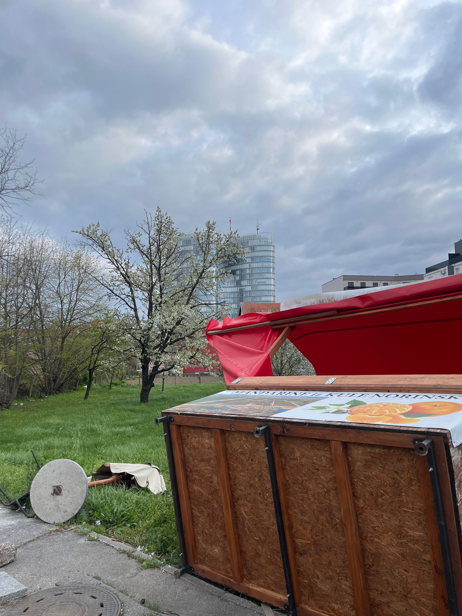 The image depicts an outdoor scene in Zagreb, Croatia. A vendor's stall with a red awning is in the right side of the frame. Behind the stall is a green lawn with trees, some flowering. In the backgro…read more