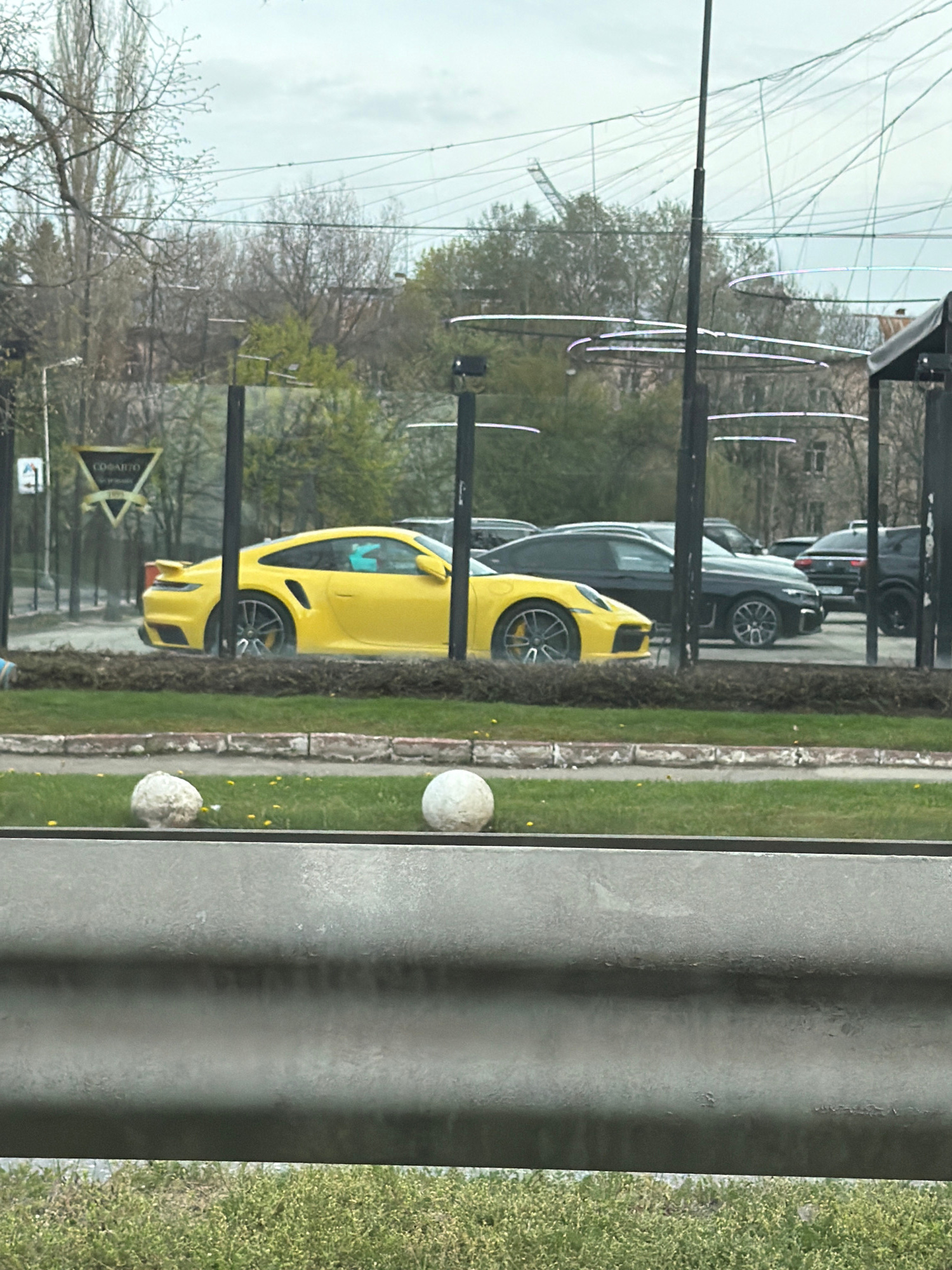 The image, rotated 90 degrees clockwise, captures an outdoor urban or suburban scene under an overcast sky. In the foreground, a bright yellow sports car, possibly a Porsche, is prominently featured,…read more