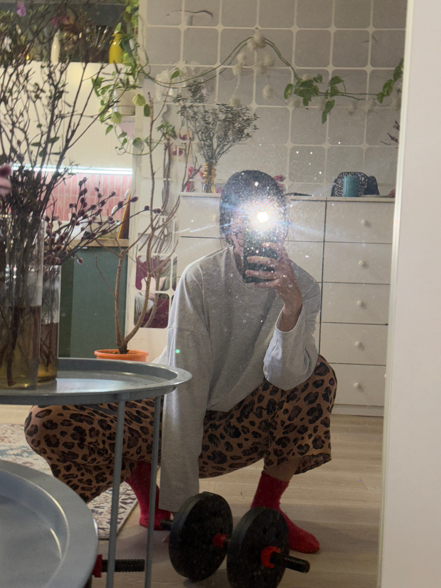 A person is reflected in a mirror taking a selfie. The person is wearing a gray sweater, leopard-print pants, and red socks. There are dumbbells on the floor near the person's feet. Various plants are…read more