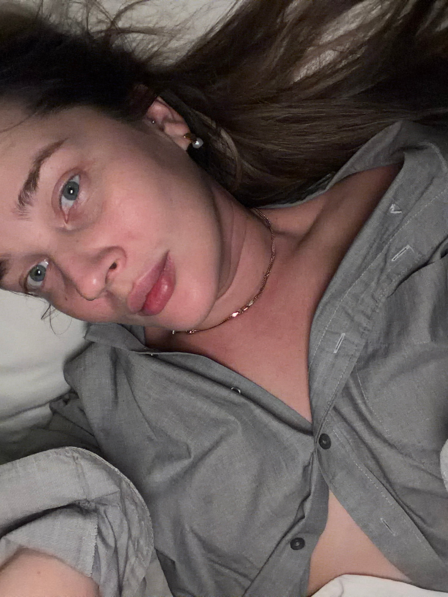 A woman lies supine against a white surface, possibly a bed. She is wearing a gray button-down shirt, partially unbuttoned, and a gold necklace. She has light skin, blue eyes, and brown hair. She has…read more